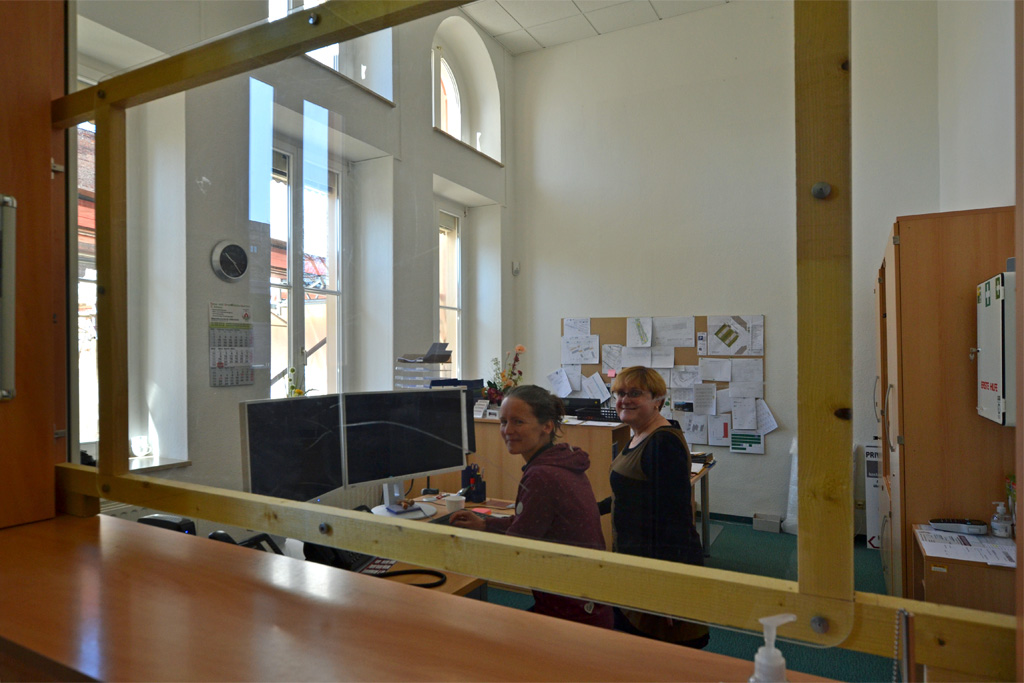 Es wirkt noch etwas provisorisch. Aber was ist in diesen Tagen nicht provisorisch. Die Plexiglasscheibe ist an einen einfachen Holzrahmen geschraubt. Und sie erfüllt ihren Zweck. Sie bringt einen Schutz zwischen die Vorübergehenden und die Mitarbeiter unseres Servicebüros am Empfang. Einen Schutz gegen eine zu ungehinderte Verbreitung des Corona-Virus Covid-19. „Das war erstmal gewöhnungsbedürftig“, sagt Gerlind Görner-Horn vom Serviceteam. Aber ja, sie fühle sich sicherer. „Den Zwei-Meter-Abstand würde man nicht einhalten. Da müsste ich ja weit hinten stehen.“ Und wie dann Autoschlüssel und Co. herausreichen? Kollegin Dorota Chuderska stimmt zu: Die Scheibe ist gut. Auch wenn ihr aufgefallen ist, dass alle auf beiden Seiten nun lauter sprechen müssen am Empfang.