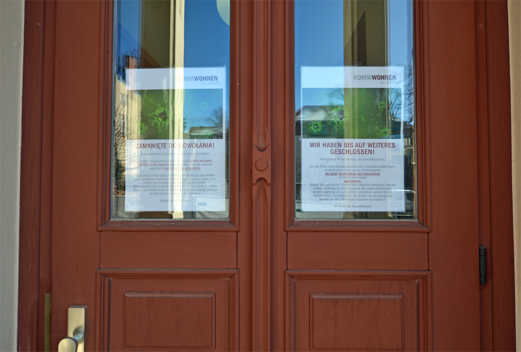 Generell ist es ruhiger als sonst am Eingang der KommWohnen-Geschäftsstelle. Die Tür öffnet sich nur mit Mitarbeiterausweis. Die Menschen, die noch vor zwei Wochen vor der geschlossenen Tür standen und die zweisprachigen Hinweiszettel über die Schließung lasen, sind selten geworden. Im Wartezimmer gegenüber sitzt niemand mehr. Die Flyer, die Werbung für Veranstaltungen machen, wirken wie aus einer anderen Welt. Und irgendwie sind sie das ja auch…