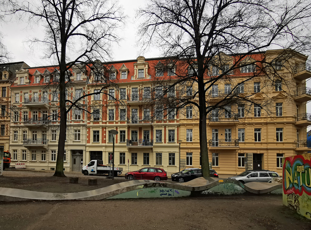 Die frisch sanierten Fassaden der Gründerzeithäuser werten das ganze Dreieck des sogenannten Leipziger Platzes nahe der Rauschwalder Straße auf. Die Straßenfassaden sind mit all den Ornamenten denkmalschutzgerecht saniert worden. Auch die überarbeiteten historischen Balkone geben wieder ein schönes Bild ab. Auf der Hofseite ermöglichen die neuen XXL-Balkone, die zu fast jeder Wohnung gehören, den Mietern einen Platz an der Sonne. Im Keller der Gebäude arbeitet ein Blockheizkraftwerk. Den Bewohnern gibt das neben der Wärme den Vorteil, dass KommWohnen auch den Strom liefert und sie sich um keine weiteren Verträge zu kümmern brauchen. An der Leipziger Straße befindet sich nun die insgesamt dritte Wohnanlage von KommWohnen, die von einem solchen Kraftwerk versorgt wird.