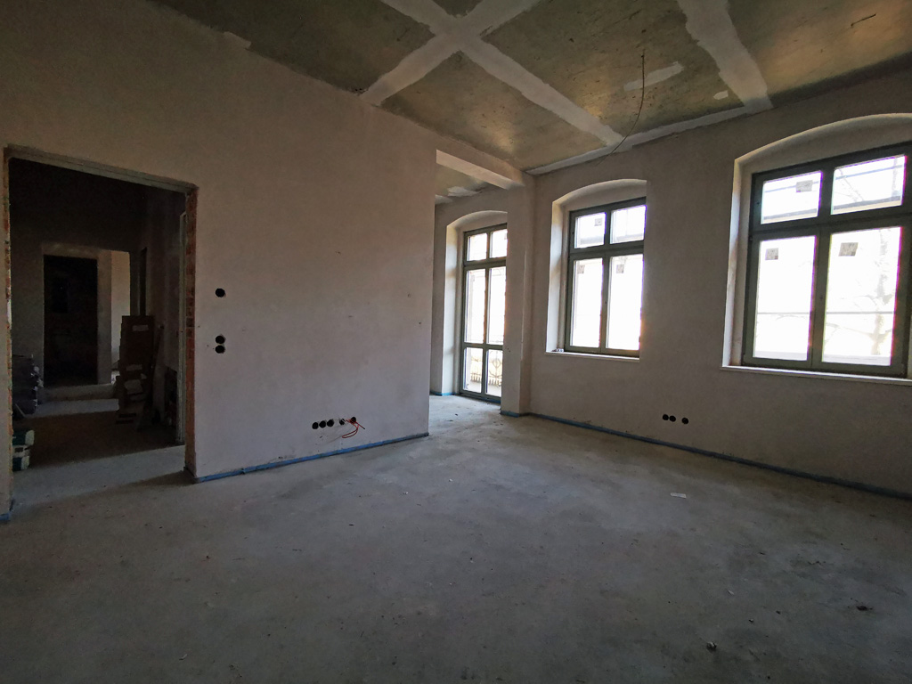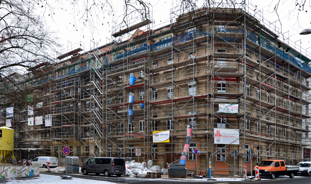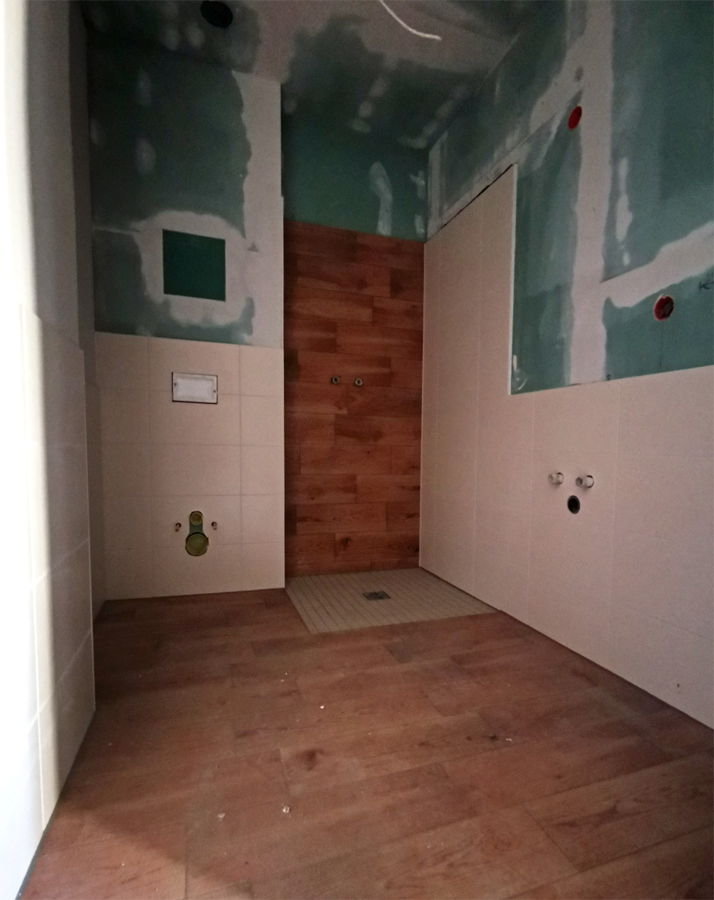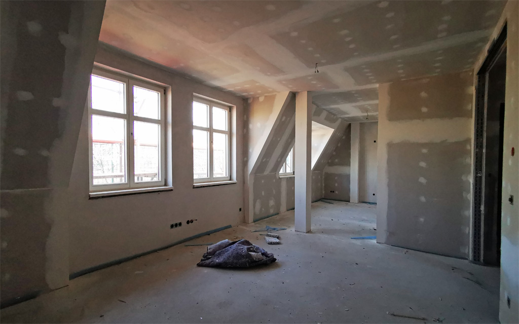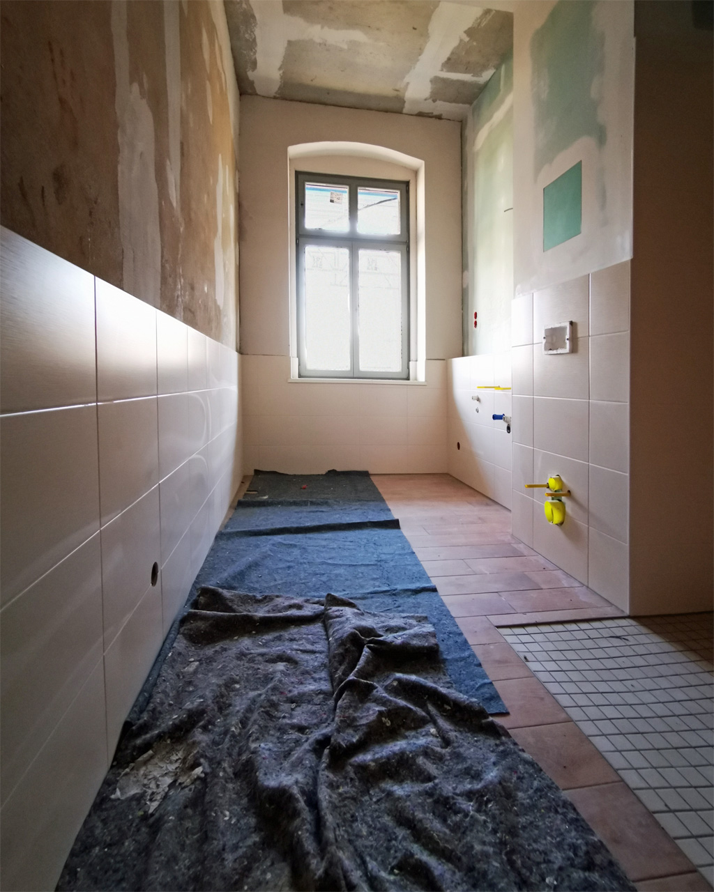 Ja, die Bauarbeiten in den Häusern Leipziger Straße 19/20/20a sind so weit vorangeschritten, dass man sich solche Details schon gut vorstellen kann. Überall im Haus sind Handwerker fleißig. Fliesenleger statten von oben nach unten alle Bäder aus. Estrich-, Putz- und Trockenbauarbeiten sind so gut wie fertig. Corona- und Quarantäneverordnungen haben immer wieder für zeitlichen Verzug gesorgt, aber alles läuft weiter.