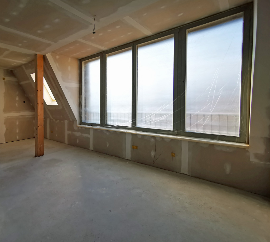 Der Platz fürs Sofa wäre schon mal gefunden. Genau hier, vor der großen Fensterfront im Dachgeschoss. Blick nach draußen, Sonne im Gesicht. Am besten mit einer Tasse Kaffee in der Hand.