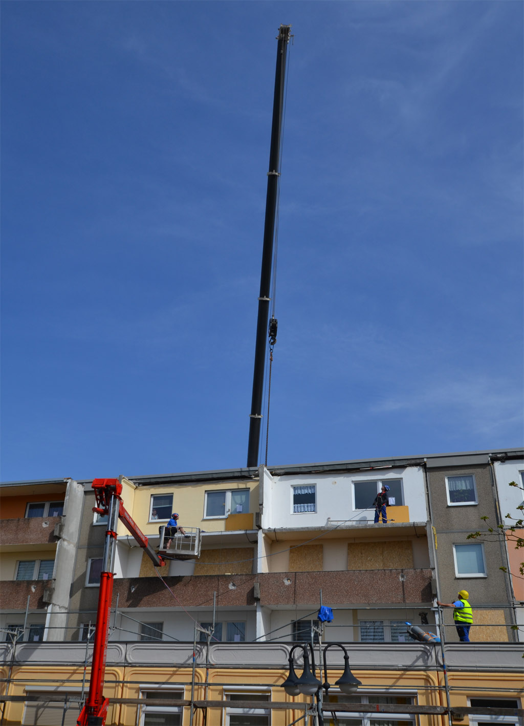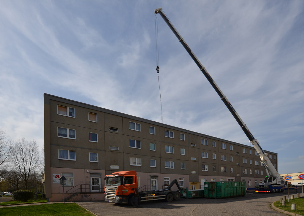 Grund war der ungewöhnliche Standort des Krans. Weil er wegen der empfindlichen Gehwegplatten und Treppen hinterm Haus nicht auf die Seite mit den Balkonen gestellt werden konnte, war er auf der anderen Seite des Gebäudes aufgebaut. Dadurch musste er entsprechend groß sein, um die Balkonplatten übers Haus heben zu können. Ein beeindruckender Anblick. Ein Mitarbeiter auf der Balkonseite lotste den Kranführer per Funkgerät. So wurde auf der einen Seite demontiert, auf der anderen zerkleinert und abtransportiert.