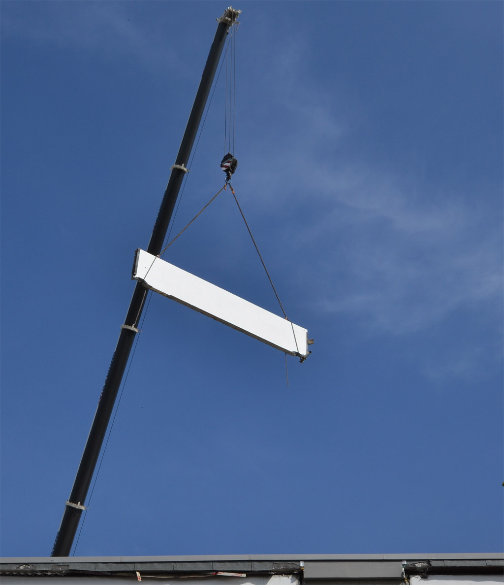 Grund war der ungewöhnliche Standort des Krans. Weil er wegen der empfindlichen Gehwegplatten und Treppen hinterm Haus nicht auf die Seite mit den Balkonen gestellt werden konnte, war er auf der anderen Seite des Gebäudes aufgebaut. Dadurch musste er entsprechend groß sein, um die Balkonplatten übers Haus heben zu können. Ein beeindruckender Anblick. Ein Mitarbeiter auf der Balkonseite lotste den Kranführer per Funkgerät. So wurde auf der einen Seite demontiert, auf der anderen zerkleinert und abtransportiert.