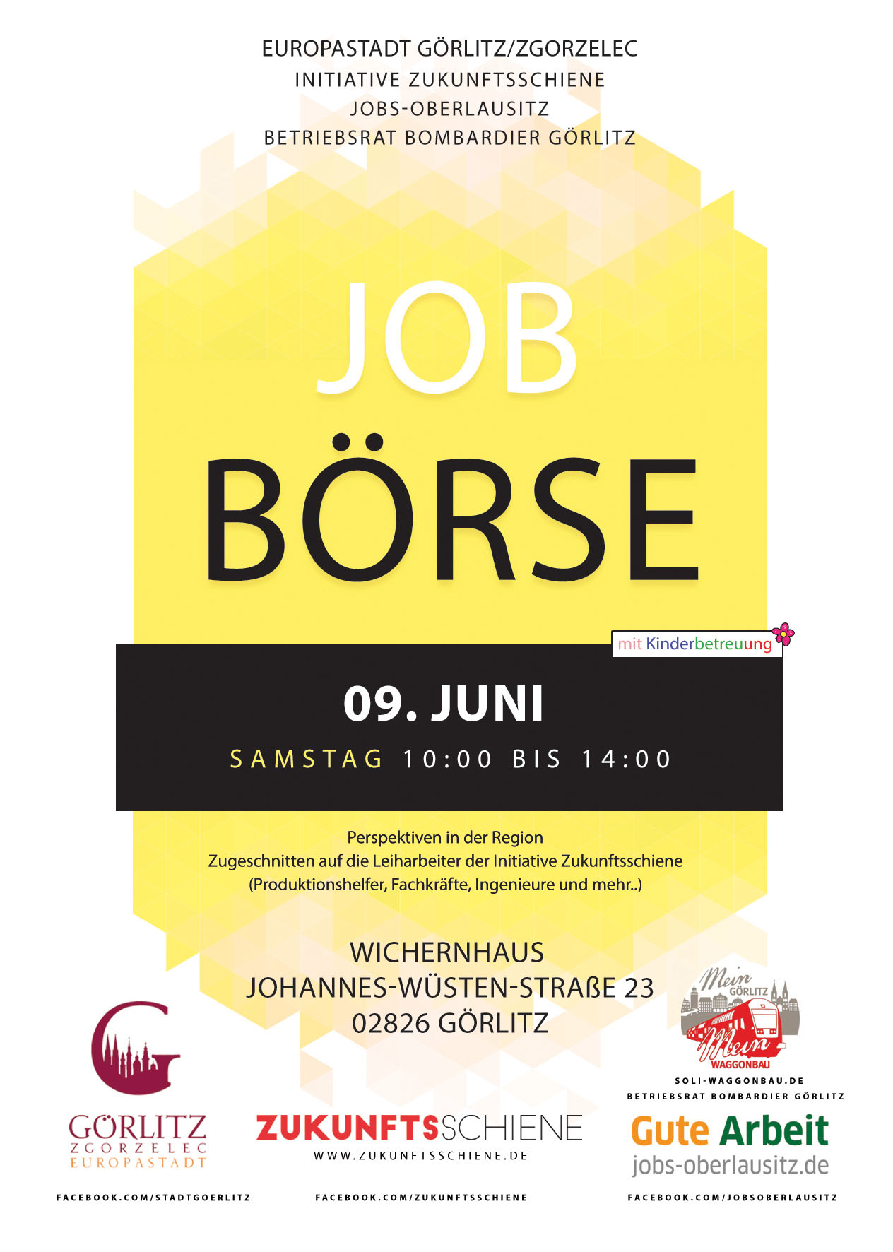 Am Sonnabend (9. Juni 2018) findet von 10 bis 14 Uhr im Wichernhaus eine Jobbörse statt. Diese richtet sich speziell an die Leiharbeiter, die aktuell oder ehemalig im Bombardier-Werk Görlitz beschäftigt sind oder waren.
