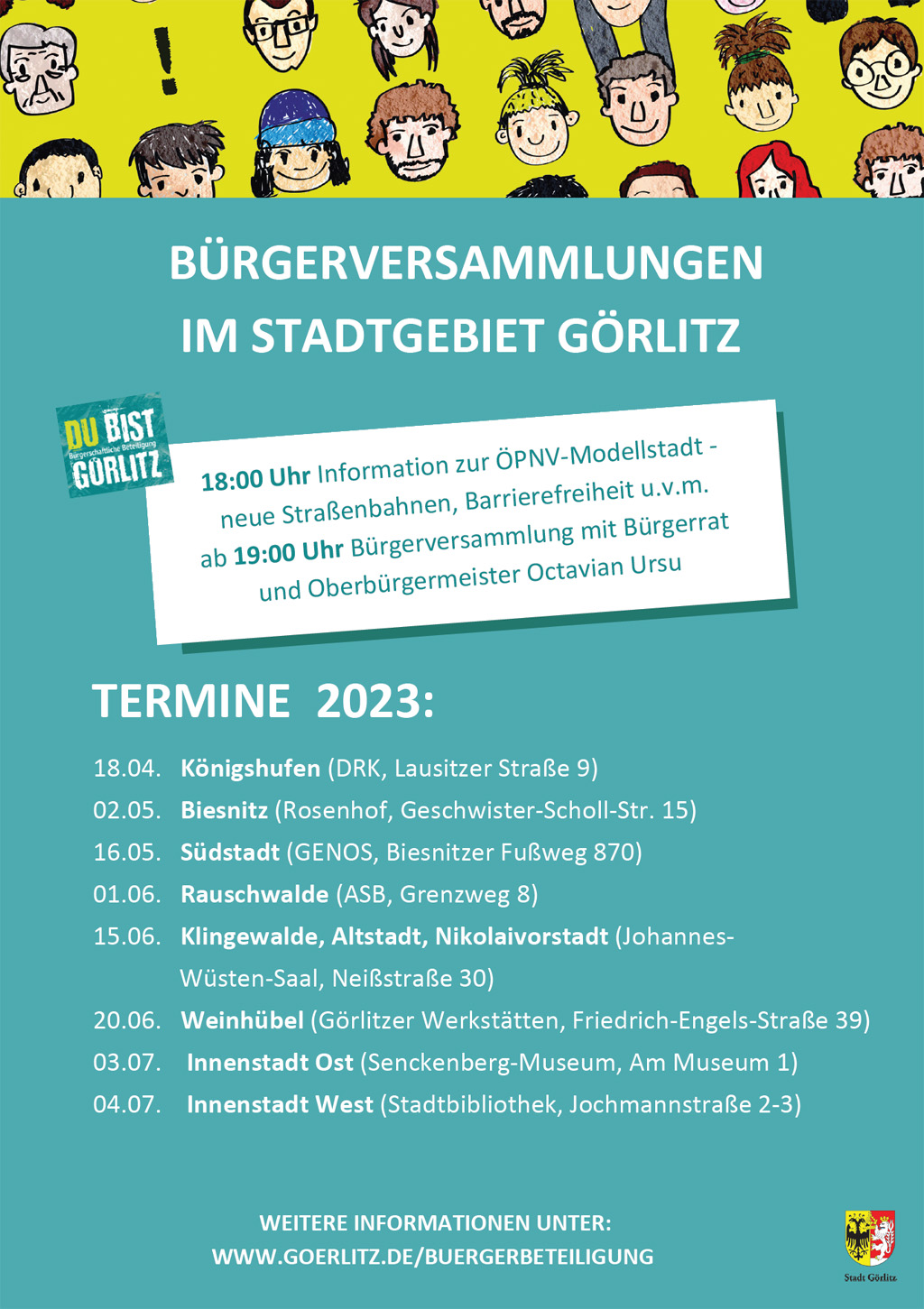 Die Görlitzer Stadtverwaltung lädt in den kommenden Monaten mehrfach zu Bürgerversammlungen ein. Das Veranstaltungsformat rotiert durch die Stadtteile. Großes Thema ist die ÖPNV-Modellstadt, also die künftige Gestaltung des öffentlichen Personennahverkehrs. Es geht dabei um die neuen Straßenbahnen, um Barrierefreiheit und manches mehr. Daran anschließend gibt es eine Bürgerversammlung gemeinsam mit dem jeweiligen Bürgerrat und Oberbürgermeister Octavian Ursu.