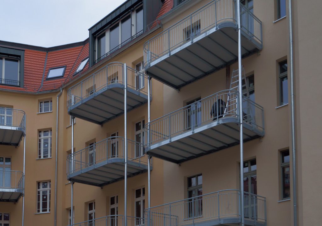 Hoher Besuch diese Woche an der Leipziger Straße: Ein Kran hat die Balkone über die Dächer auf die Hofseite der Gebäude gehoben. 3,60×2,50 Meter sind sie groß − und bieten damit großzügig Platz für Tisch, Stühle und Pflanzen. Jede der insgesamt 44 Wohnungen in dem Gebäudekomplex wird später einen Balkon haben. Manche mit Blick in…
