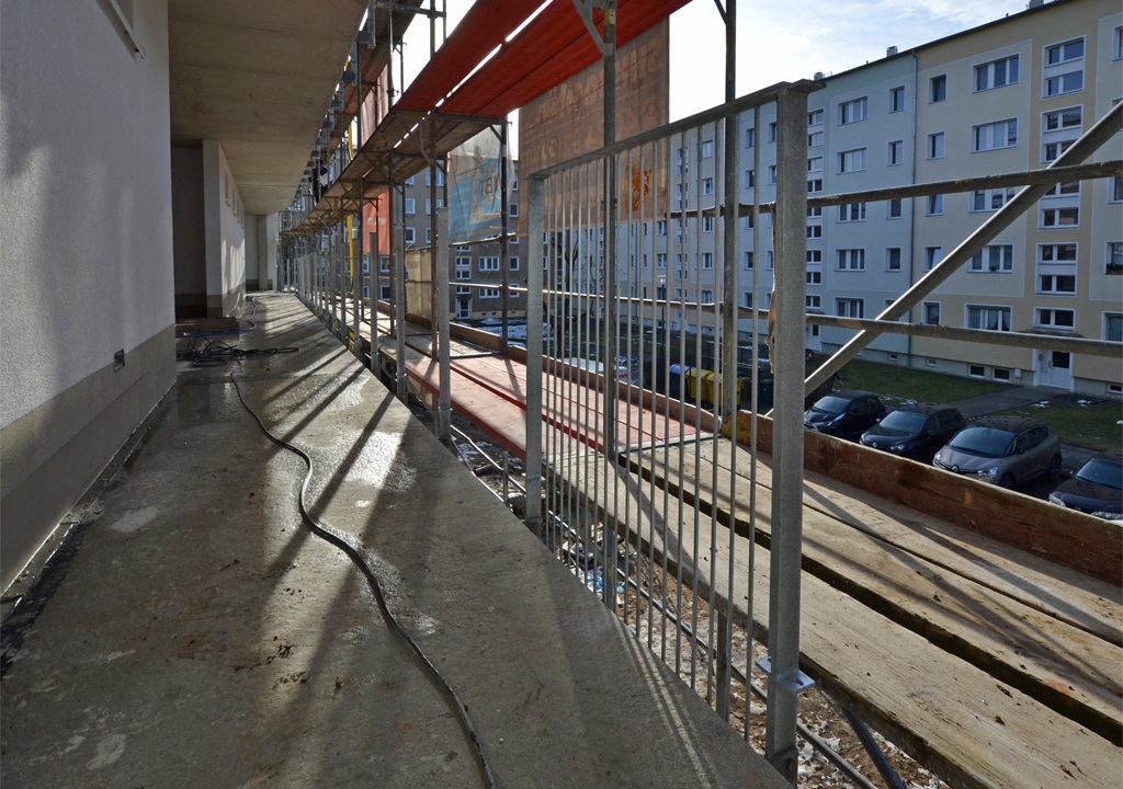 Es geht an die Details. An der Arthur-Ullrich-Straße 16 läuft der Anbau der Geländer an den Laubengängen. Damit wird das Gesicht der Straßenfassade fertig, und die Gerüste können fallen. Am Giebel (und vereinzelt an der Hofseite) sind die Geländer schon dran. Dort fehlen aber natürlich noch die Balkone. Drinnen sind die Fliesenleger gestartet. Vom obersten…