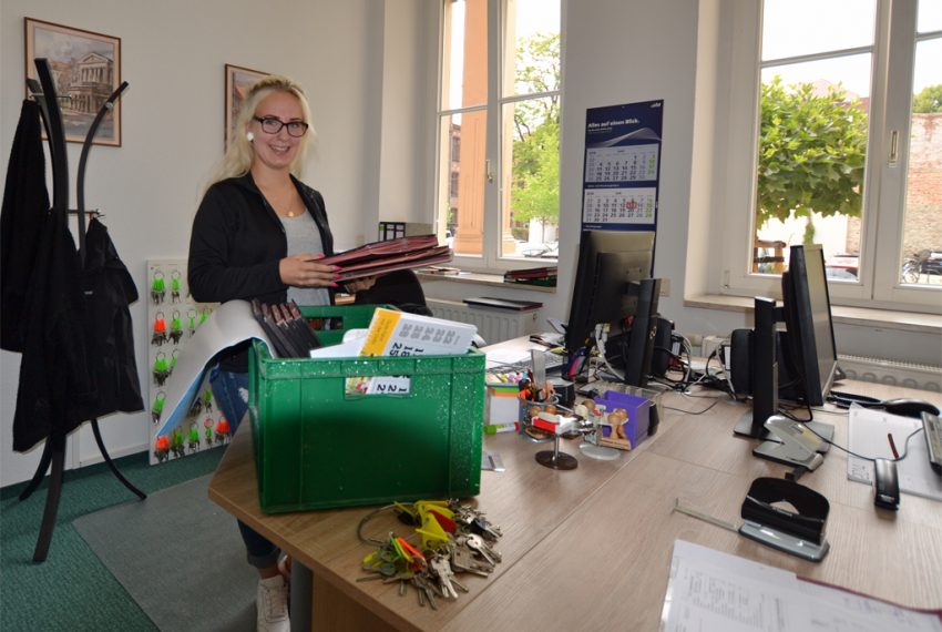 KommWohnen-Auszubildende Sarah Hübner hatte heute alle Hände voll zu tun mit Ausräumen von Kisten, Sortieren von Akten und dem Einrichten des neuen Büros. Ab Montag, dem 16. Juli, hat das KommWohnen-Vermietungsbüro seinen Sitz auf der Konsulstraße 65. Im Erdgeschoss der Geschäftsstelle von KommWohnen können sich Mieter und Mietinteressenten mit ihren Anliegen an unsere Mitarbeiter wenden….