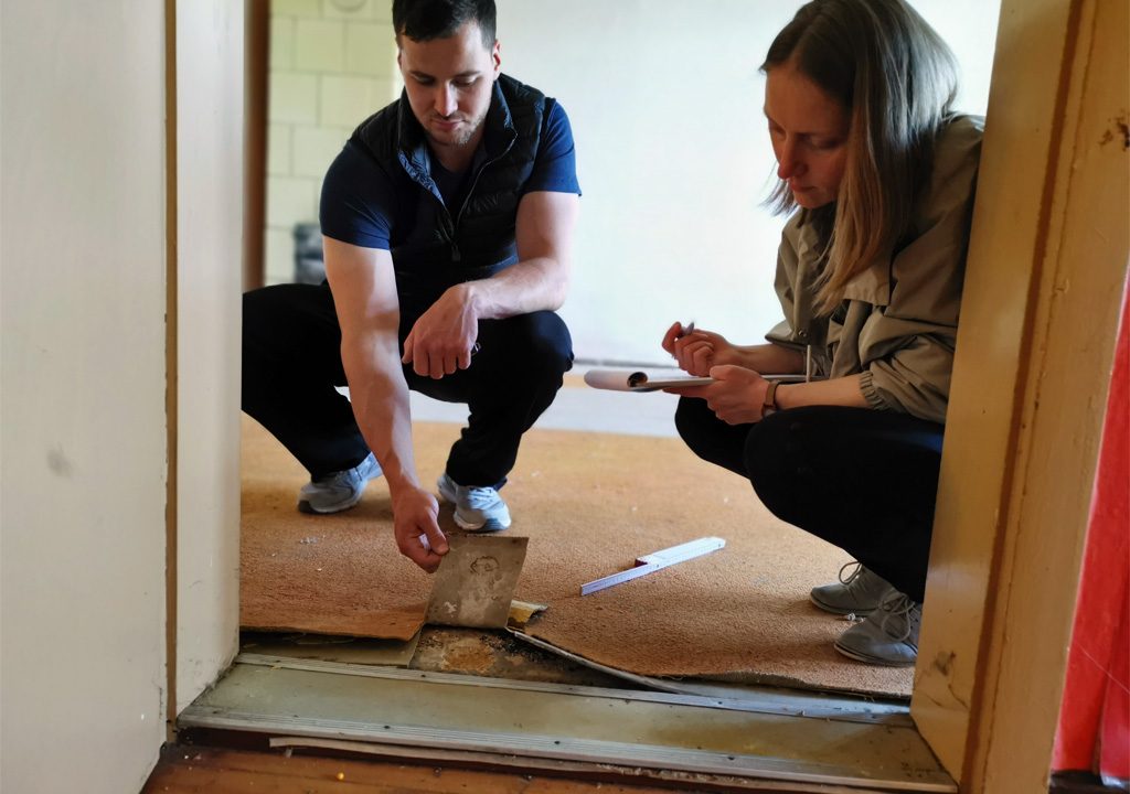 Ein kleines rechteckiges Stück ist aus dem alten Teppich geschnitten. Darunter ist Linoleum zu sehen, darunter weitere Schichten, irgendwann wohl auch Holzbalken. „Ich bin kurz gesprungen, der Boden federt leicht“, sagt Jonas Wagner. „Also ist es eine Holzbalkendecke.“ Er und Yvonne Fandke sind gerade im ersten Stock der Kränzelstraße 22/23. Gemeinsam mit zwölf Mitstudierenden erforschen…
