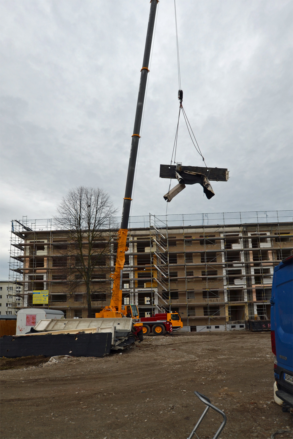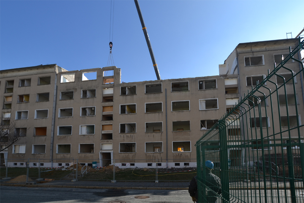Pünktlich zum Frühlingsbeginn gibt es jetzt mehr Frischluft und Sonneneinstrahlung im Block Arthur-Ullrich-Straße 10-16. Am Montag haben Bauarbeiter damit begonnen, das Dach des Gebäudes zu entfernen. Ein Kran hob Platte für Platte aus dem fünften Stock nach unten.