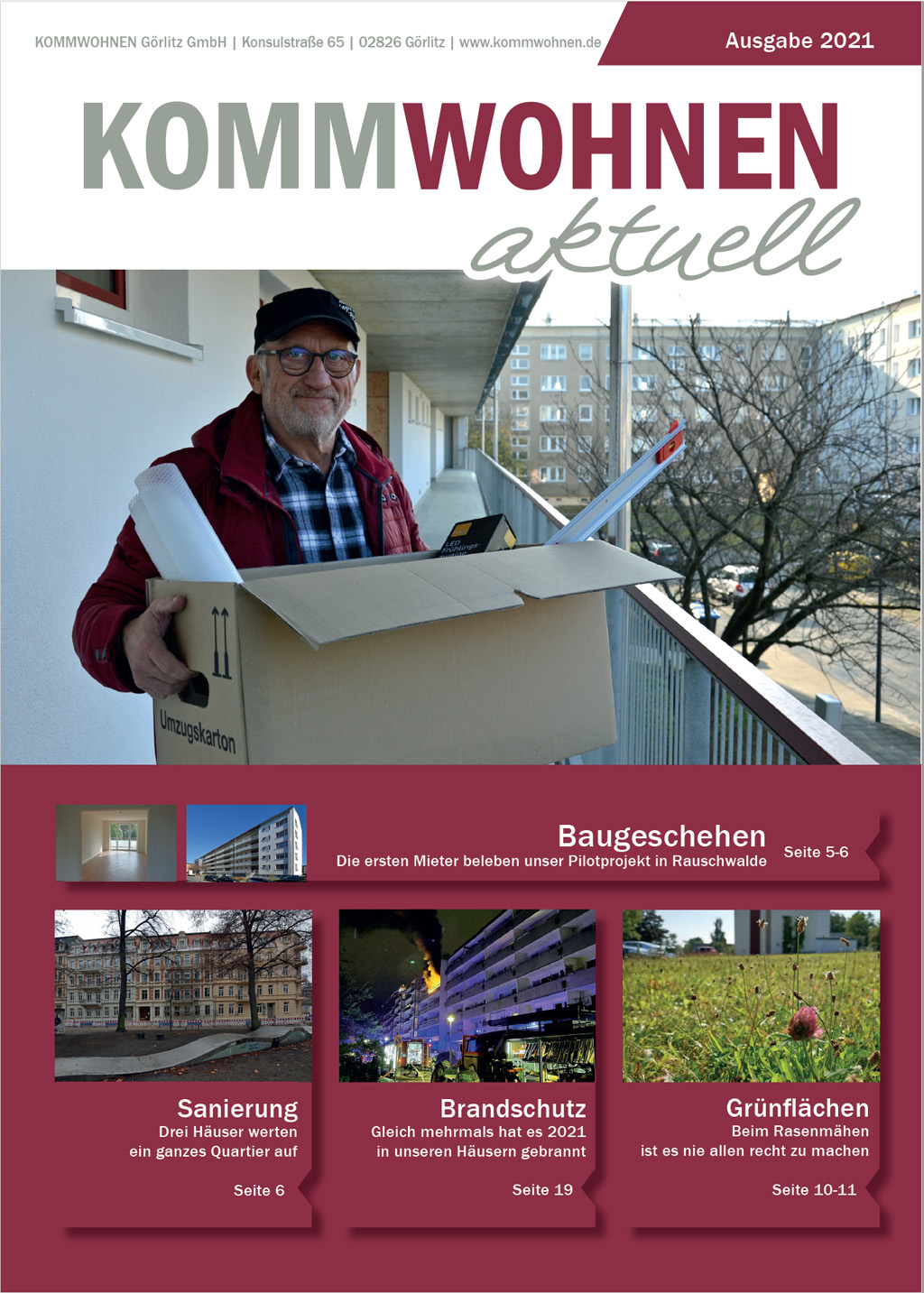 Auf 28 Seiten gibt es viel zu erfahren. Das Baugeschehen des Jahres spielt natürlich eine große Rolle, vor allem mit der Arthur-Ullrich-Straße 16 und der Leipziger Straße 19, 20 und 20a. KommWohnen-Geschäftsführer Arne Myckert gibt es Interview als Jahresfazit (das übrigens auch hier als Videodatei zu sehen ist). Außerdem geht es um Legionellen, Brände in unseren Objekten, Stromzähler, das Projekt Probewohnen, Naturschutz  und um Mieter an der Wielandstraße, die seit mehr als 50 Jahren Nachbarn sind. Wichtig für unsere Mieter ist auch die neue Struktur der Kundenbetreuer, die ab Januar gilt. Dazu sind alle Infos und die jetzt zuständigen Ansprechpartner im Heft zu finden (und bald natürlich auch auf unserer Homepage).
