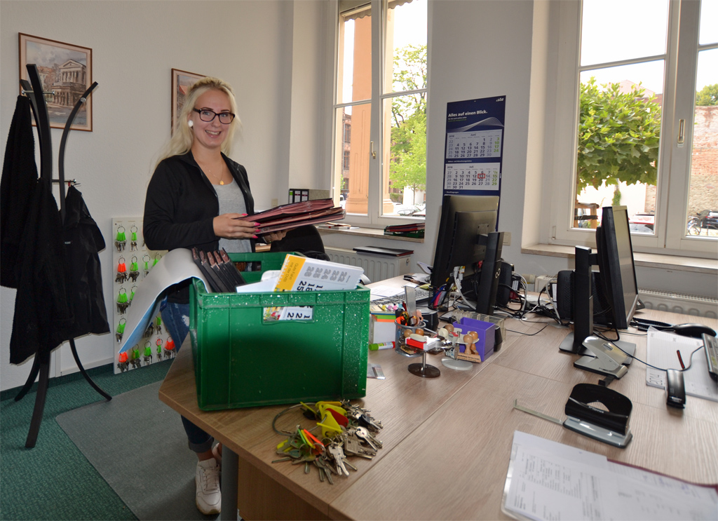 KommWohnen-Auszubildende Sarah Hübner hatte heute alle Hände voll zu tun mit Ausräumen von Kisten, Sortieren von Akten und dem Einrichten des neuen Büros. Ab Montag, dem 16. Juli, hat das KommWohnen-Vermietungsbüro seinen Sitz auf der Konsulstraße 65. Im Erdgeschoss der Geschäftsstelle von KommWohnen können sich Mieter und Mietinteressenten mit ihren Anliegen an unsere Mitarbeiter wenden. Diese sitzen im Kundenbüro sowie im bisherigen Wartebereich. Letzterer ist dann nur wenige Meter weiter. Das bisherige Vermietungsbüro auf der Jakobstraße 4a wird geschlossen.