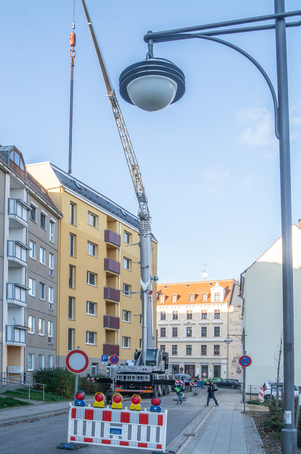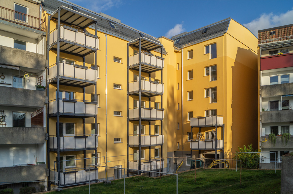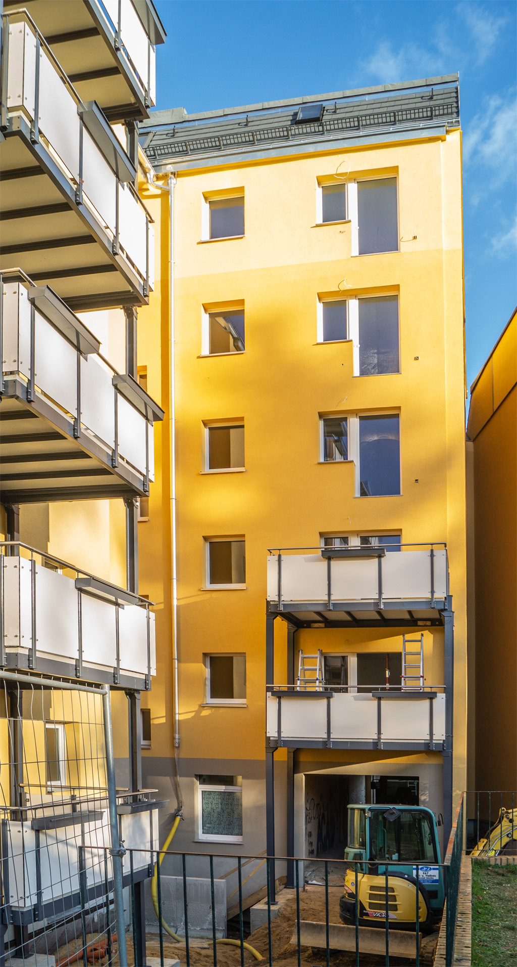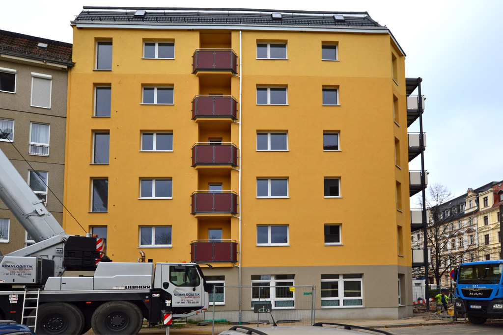 Heute sind sie fertig geworden, die letzten noch fehlenden Balkone an der Hohen Straße 19. Jetzt hat das gesamte Objekt, das wir mit der Heilige-Grab-Straße 13 zusammengelegt haben, XXL-Balkone für seine künftigen Mieter. Wegen der fehlenden Zufahrt zum Innenhof schwebten die Balkone mithilfe eines Krans über das Haus. An der Hofseite montierten Handwerker sie dann.