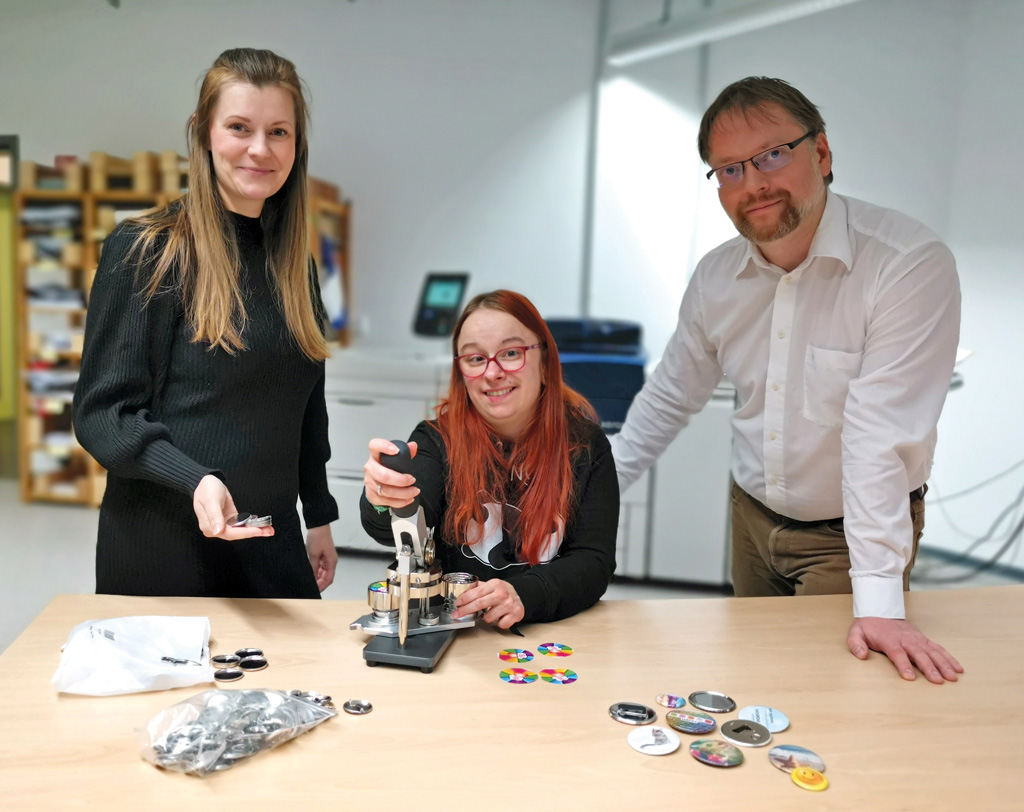 Sabine Christian (Foto Mitte) ist vorberei­tet. Am nächsten Tag hält die Mitarbeite­rin der Görlitzer Werkstätten einen Vortrag und macht in der Druckerei ein paar But­tons fertig. Hier quasi in eigener Sache, aber die Einrichtung entwickelt sich seit Jahren immer mehr zu einem Auftragneh­mer für etliche Kunden der Region. Auch wir als KommWohnen haben jetzt zum bereits dritten Mal die Druckdaten unseres jährlichen Mieterjournals an die Werkstätten gesandt. Dieser Tage wird es dort gedruckt, damit es unsere Mieterinnen und Mieter kurz vor Weihnachten in ihren Briefkästen finden.