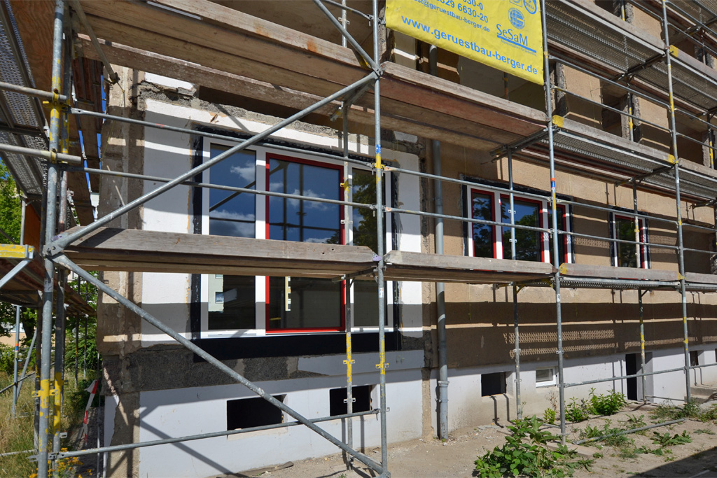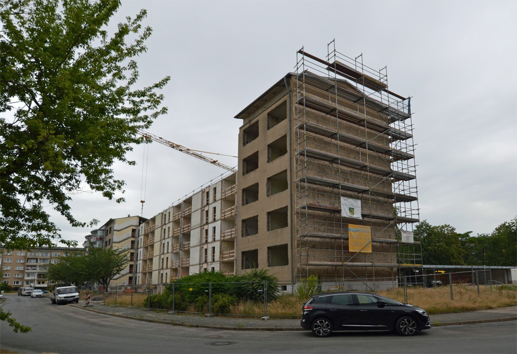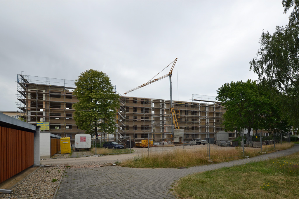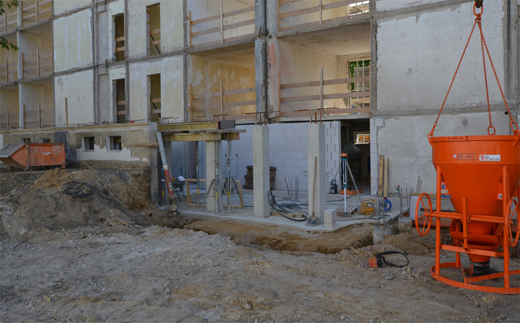 Ab jetzt geht es aufwärts. Der Abriss in Rauschwalde ist geschafft (bis auf die alten Treppenhäuser in ein paar Monaten), nun wird wieder aufgebaut. Derzeit entsteht das Kellergeschoss. Auf den Fotos ist es an den schmalen Fensteröffnungen erkennbar.