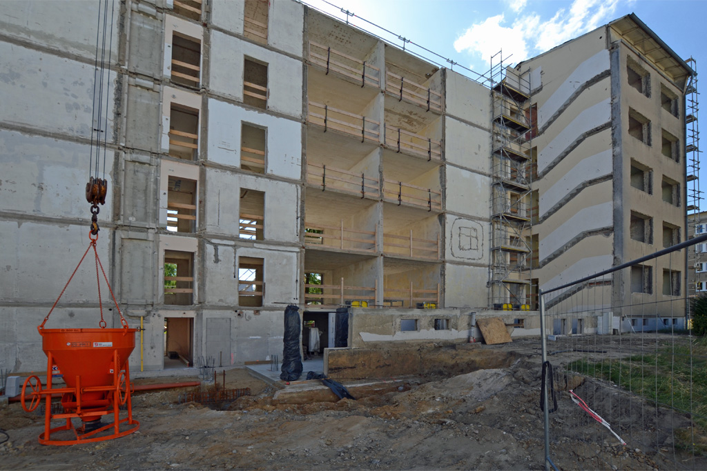 Ab jetzt geht es aufwärts. Der Abriss in Rauschwalde ist geschafft (bis auf die alten Treppenhäuser in ein paar Monaten), nun wird wieder aufgebaut. Derzeit entsteht das Kellergeschoss. Auf den Fotos ist es an den schmalen Fensteröffnungen erkennbar.