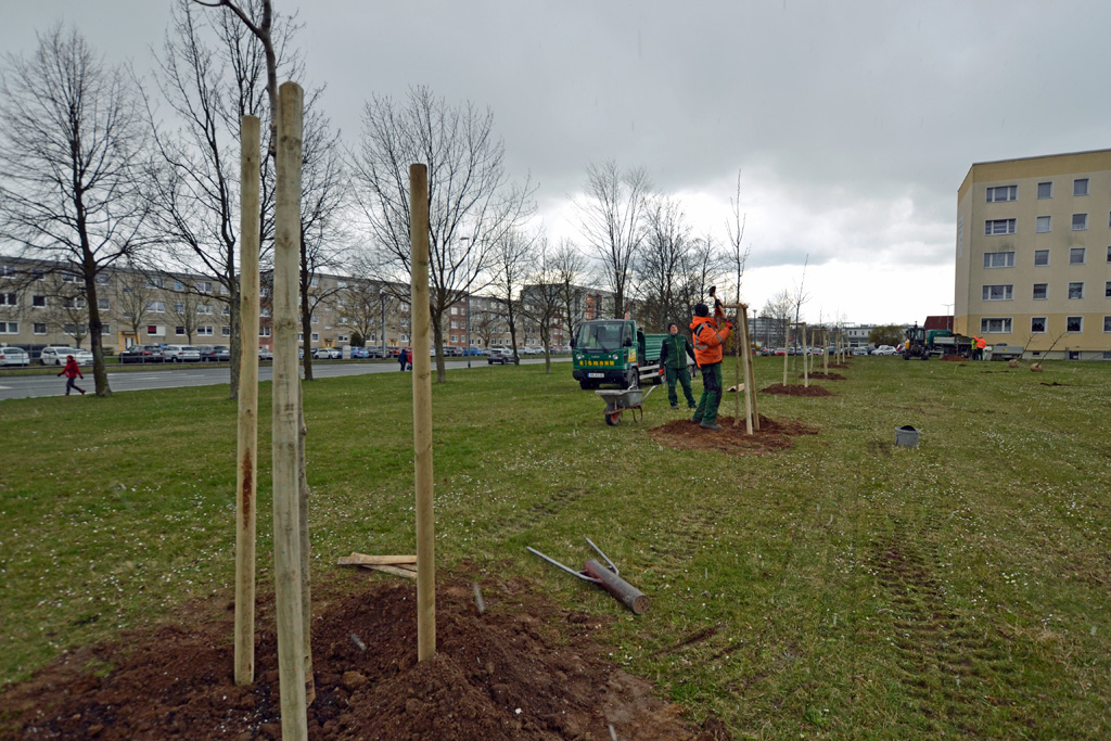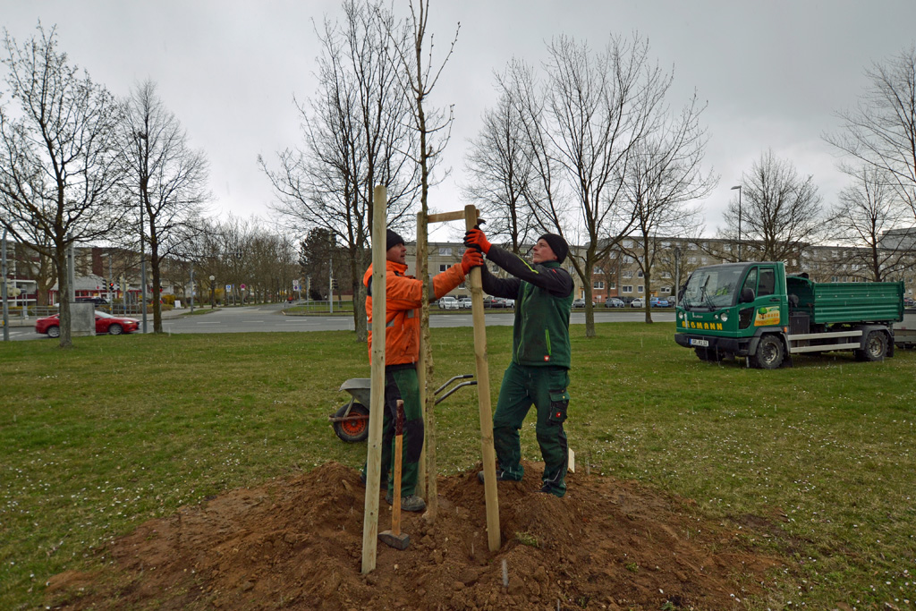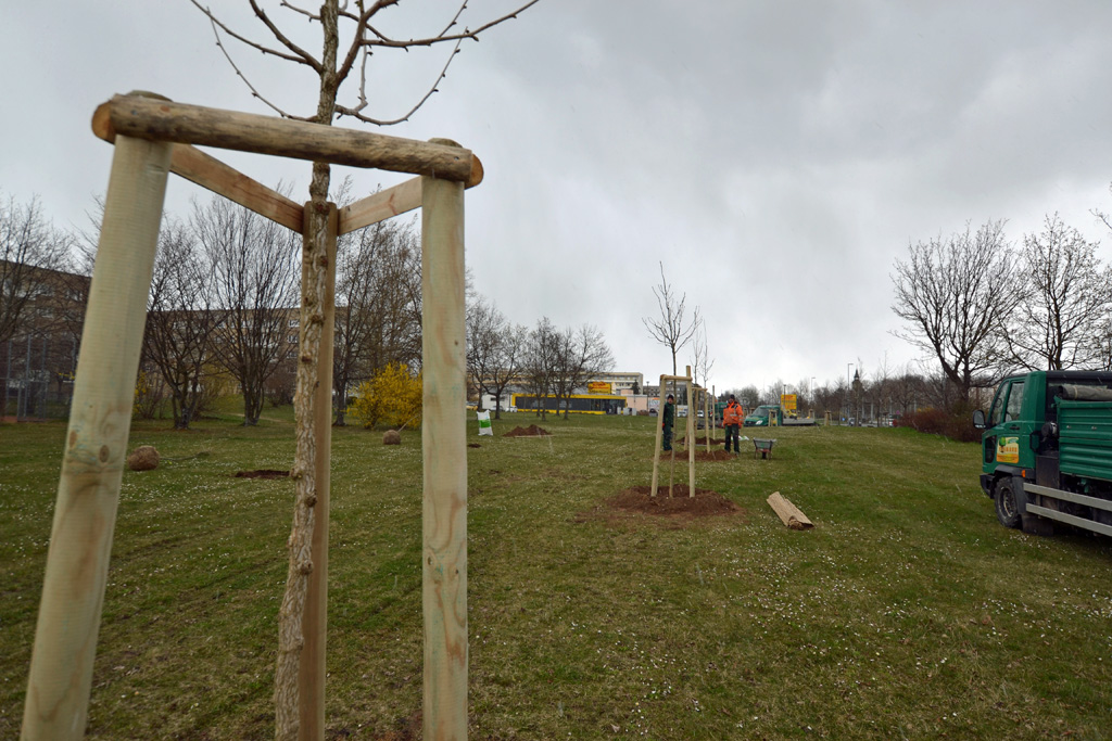 Ab wie vielen Bäumen kann man eigentlich von einem Wald sprechen? Ab 20? Lächerlich. Ab 25? Leicht! Es sind gleich 27 Bäume, die wir diese Woche an der Schlesischen Straße pflanzen lassen. Sie stehen zwischen Nordring und An der Terrasse. Unsere Sachbearbeiterin Garten- und Landschaftsbau, Susanne Krause, hat die Sorten ausgewählt, und die Schöpstaler Firma Baumschule Rißmann hat sie für uns in die Wiese gesetzt. Deren Mitarbeiter Rico Deutschmann und Frank Böhme ließen sich mit ihren Kollegen dabei auch nicht von dem miesen Wetter abhalten.