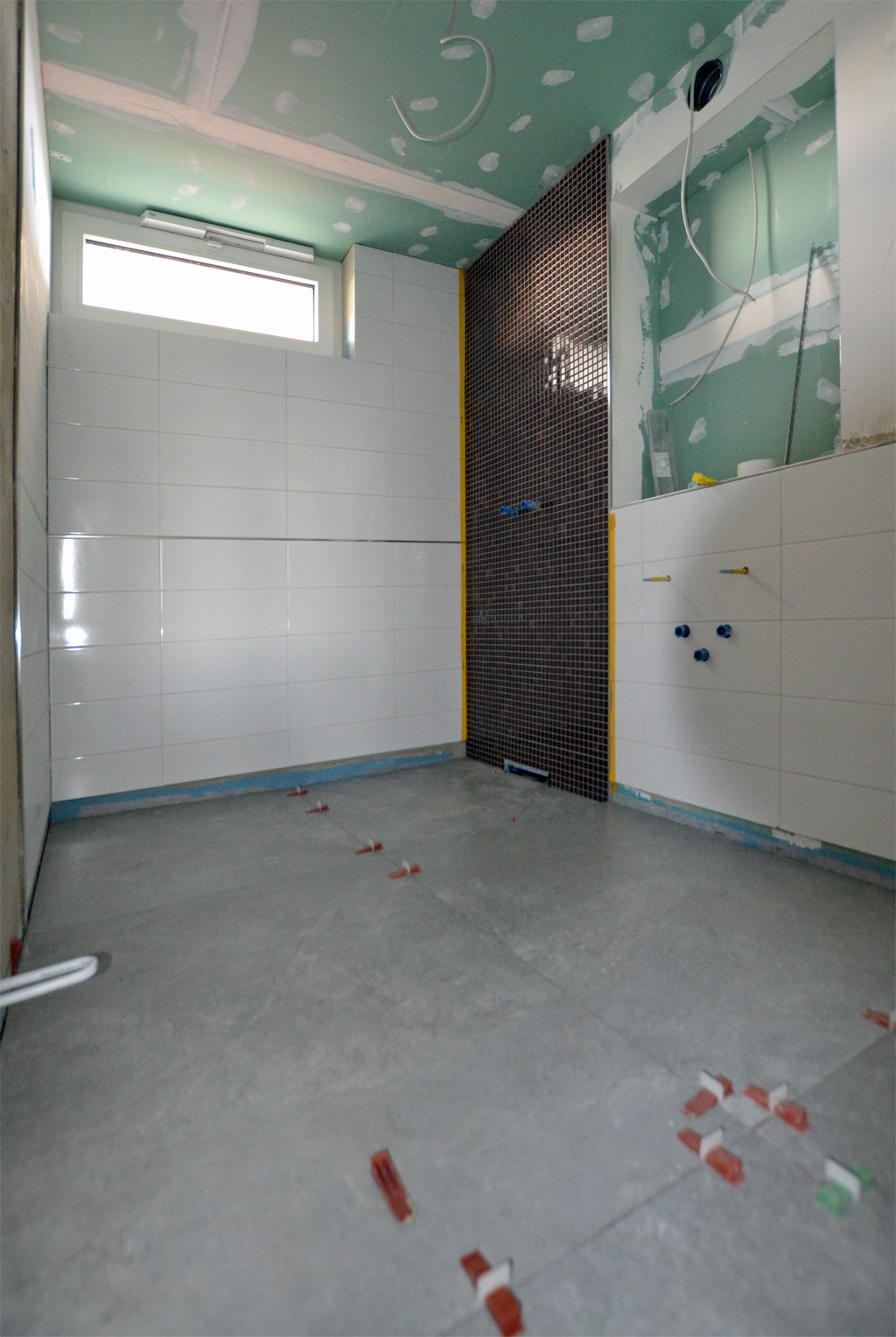 Drinnen sind die Fliesenleger gestartet. Vom obersten Geschoss beginnend, werden nach und nach alle Badezimmer gefliest. Clou sind die bodengleichen Duschen: an der Wand ein dunkles Mosaik (das in fast jeder Etage eine andere Farbe hat) und ein Abfluss, durch den das Wasser quasi in der Wand verschwindet.