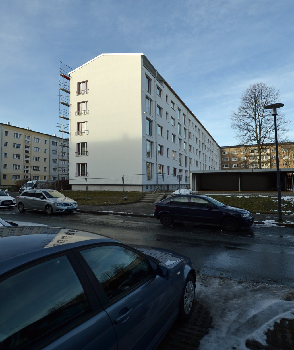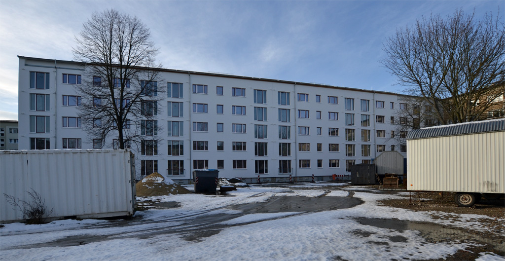 Es geht an die Details. An der Arthur-Ullrich-Straße 16 läuft der Anbau der Geländer an den Laubengängen. Damit wird das Gesicht der Straßenfassade fertig, und die Gerüste können fallen. Am Giebel (und vereinzelt an der Hofseite) sind die Geländer schon dran. Dort fehlen aber natürlich noch die Balkone.