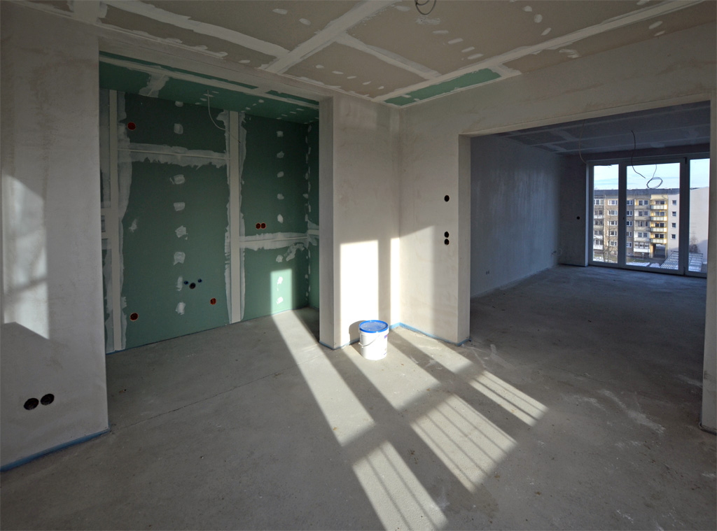 Es ist der Beginn des Innenausbaus. Maler und Fliesenleger sind da. Dann folgen nach und nach die anderen Handwerker wie Tischler, Sanitärinstallateure, Elektriker, Fußbodenleger.