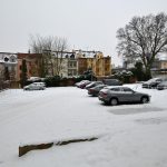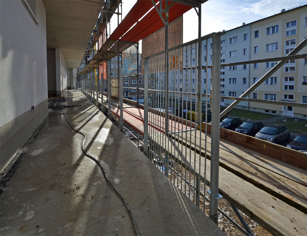 Es geht an die Details. An der Arthur-Ullrich-Straße 16 läuft der Anbau der Geländer an den Laubengängen. Damit wird das Gesicht der Straßenfassade fertig, und die Gerüste können fallen. Am Giebel (und vereinzelt an der Hofseite) sind die Geländer schon dran. Dort fehlen aber natürlich noch die Balkone.