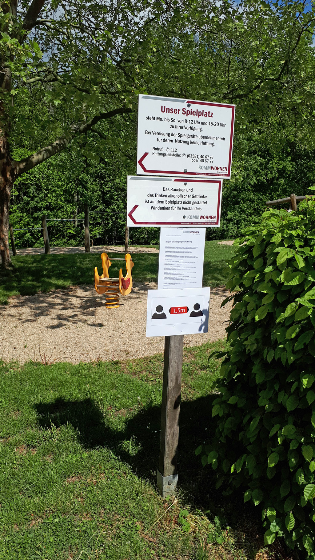 Dazu zählen vor allem der Mindestabstand von 1,5 Metern zu anderen Menschen und das Fernbleiben vom Spielplatz, wenn Symptome wie Husten, Fieber, Halsschmerzen auftreten. Eine genaue Übersicht über die Verhaltensregeln steht jeweils auf Aushängen direkt vor Ort.