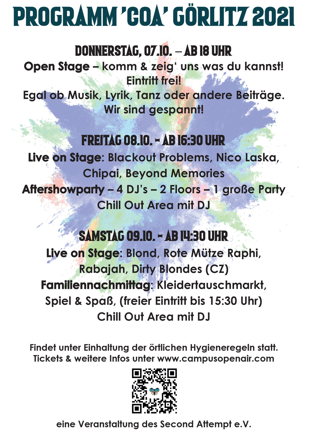 Auf dem Görlitzer Campus der Hochschule Zittau/Görlitz ist dieser Tage viel Musik zu hören. Das Festival Campus Open Air feiert Jubiläum. Und die Veranstalter vom Second Attempt e.V. haben dafür jede Menge Bands und Musiker eingeladen. Heute und morgen wird ab dem Nachmittag nochmal kräftig gefeiert, gesungen und getanzt. Damit sich die Musiker danach für den nächsten Auftritt gut ausruhen und stärken können, sponsern wir die Veranstaltung mit und stellen Übernachtung und Frühstück zum stark reduzierten Preis zur Verfügung. Wir wünschen eine wundervolle Veranstaltung und ganz viel Spaß!