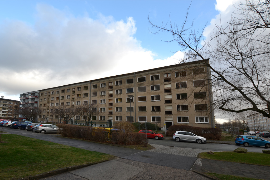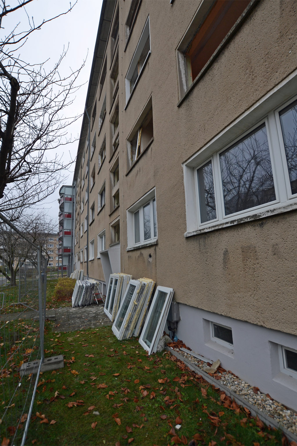 Wenn die Fenster eines Hauses seine Augen darstellen, ist die Arthur-Ullrich-Straße 10-16 jetzt blind. Zum Baustart haben die Bauarbeiter alle Fenster des Blocks ausgebaut. Einige davon werden an einem anderen Ort wiederverwendet, die ganz alten Fenster entsorgt. Nach und nach schaffen die Bauleute auch aus dem Inneren des Gebäudes alles heraus, was nicht mehr benötigt wird. Und das ist Einiges, denn der Block bekommt ein völlig neues Aussehen: mit Laubengang und Fenstern an der Giebelseite, um nur zwei Beispiele zu nennen (hier gibt es Details zu diesem Bauvorhaben).
