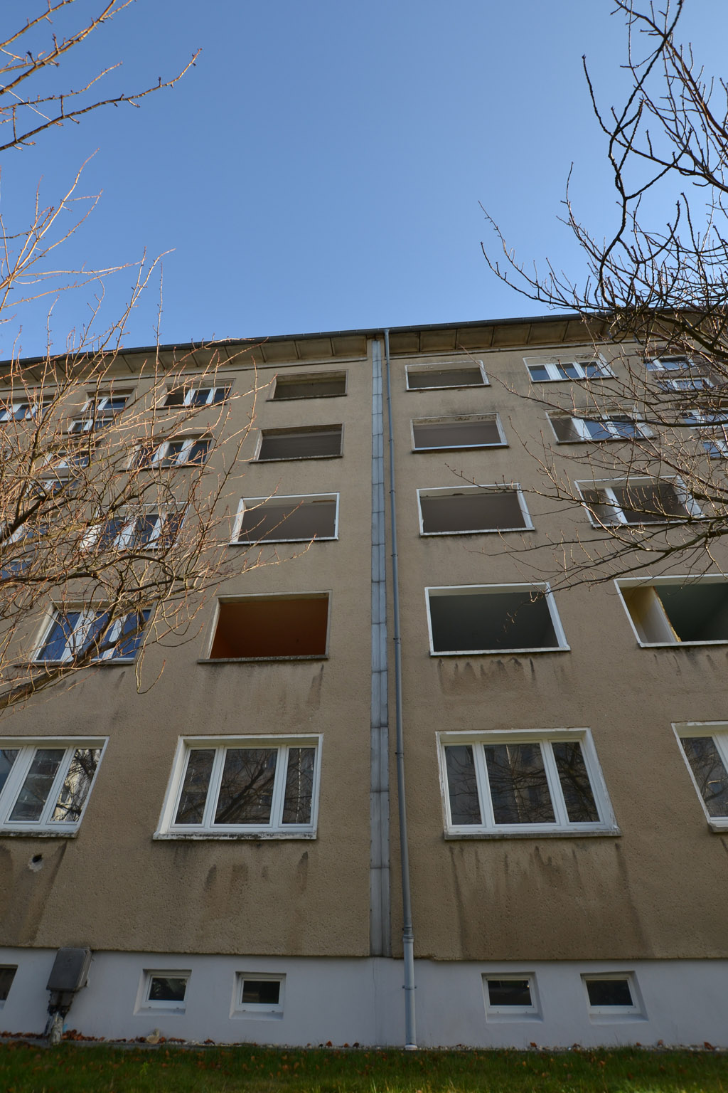 Wenn die Fenster eines Hauses seine Augen darstellen, ist die Arthur-Ullrich-Straße 10-16 jetzt blind. Zum Baustart haben die Bauarbeiter alle Fenster des Blocks ausgebaut. Einige davon werden an einem anderen Ort wiederverwendet, die ganz alten Fenster entsorgt. Nach und nach schaffen die Bauleute auch aus dem Inneren des Gebäudes alles heraus, was nicht mehr benötigt wird. Und das ist Einiges, denn der Block bekommt ein völlig neues Aussehen: mit Laubengang und Fenstern an der Giebelseite, um nur zwei Beispiele zu nennen (hier gibt es Details zu diesem Bauvorhaben).