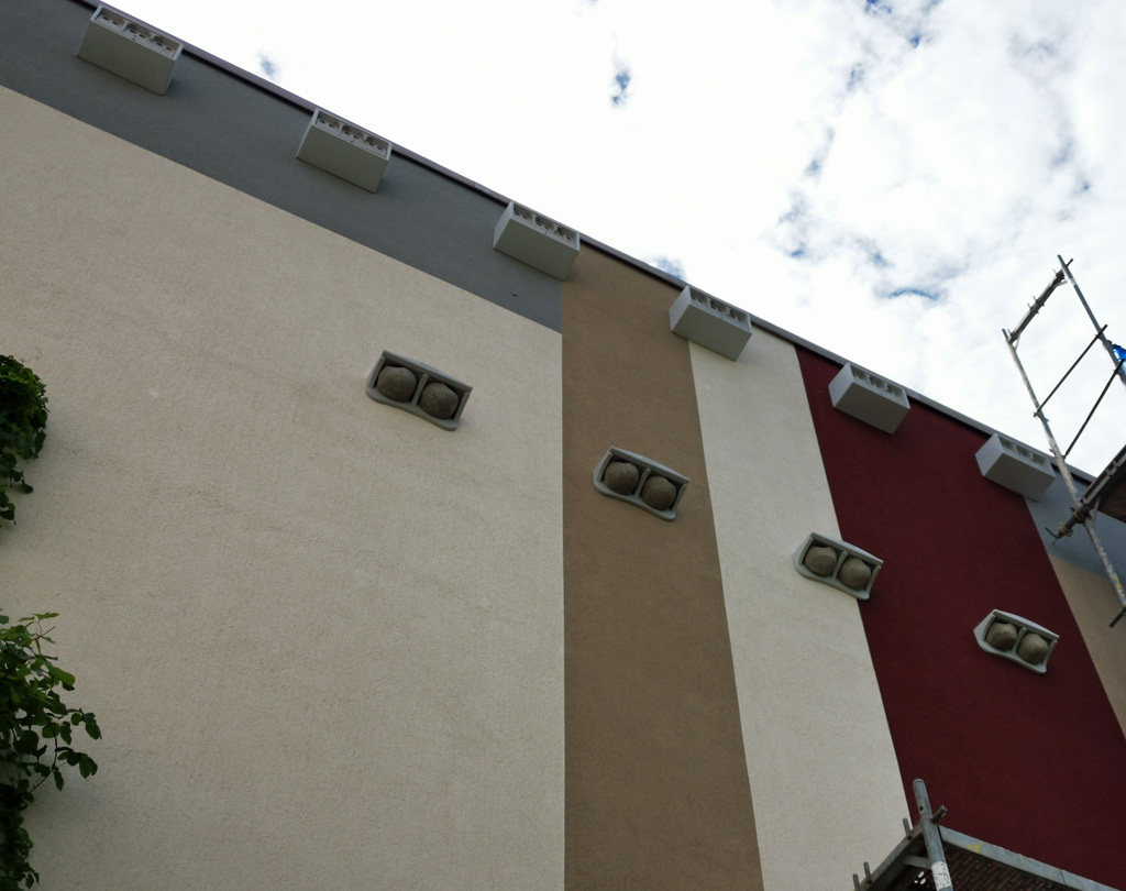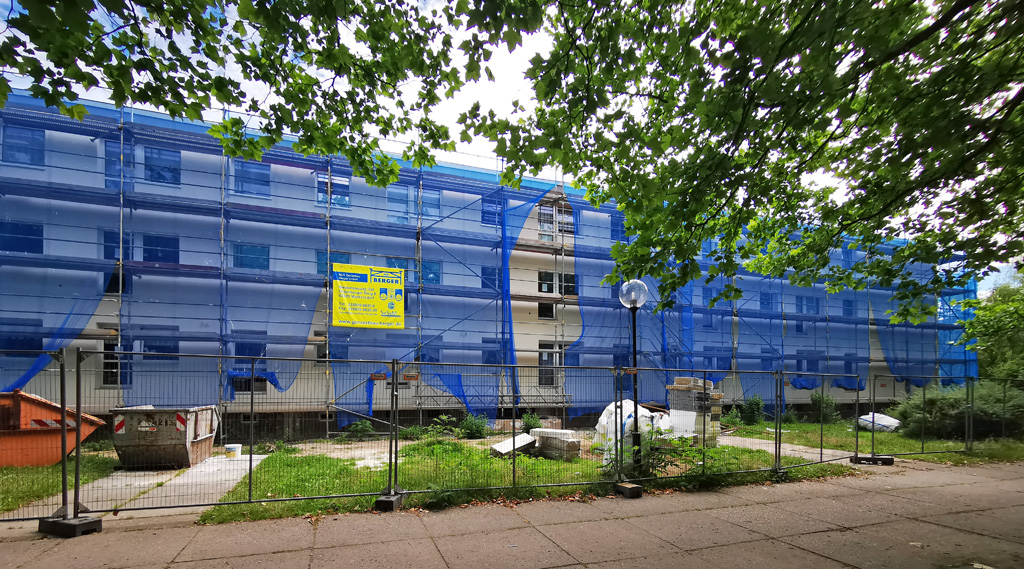 Die energetische Sanierung am Block Alexander-Bolze-Hof 26-30 schreitet voran. Von außen erstrahlen sowohl Straßen- als auch Hoffassade im mittlerweile bekannten KommWohnen-Design.