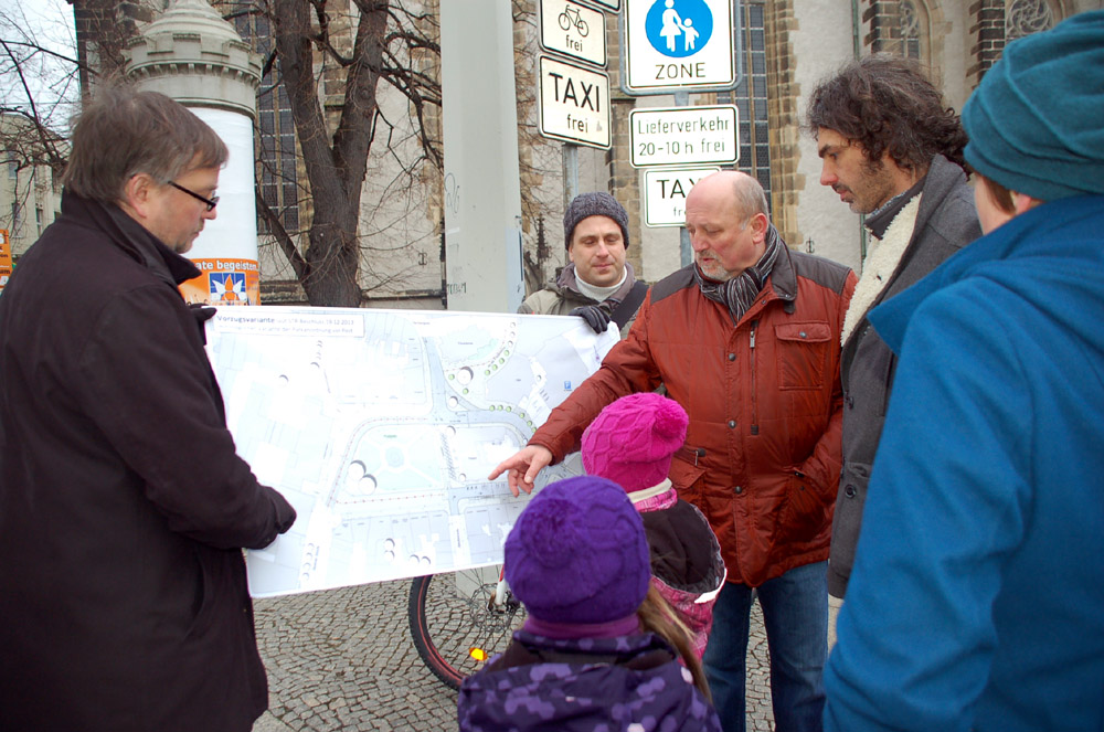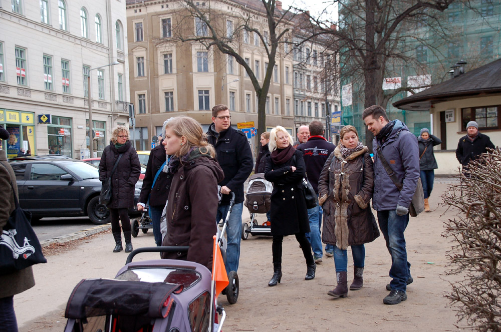 Auf dem Weg über die Berliner Straße, den Wilhelmsplatz bis hin zur Frauenkirche diskutierten die zahlreichen Teilnehmer gemeinsam mit Oberbügermeister Siegfried Deinege und Bürgermeister Dr. Michael Wieler über verkehrs- und sicherheitstechnische Aspekte, die für das Leben der Familien im Zentrum der Stadt von Bedeutung sind. Auch die Gestaltung des künftigen „Kirchplatzes“ wurde vorgestellt. Dabei wurden auch Anregungen für künftige familienfreundliche Lösungen aufgenommen.