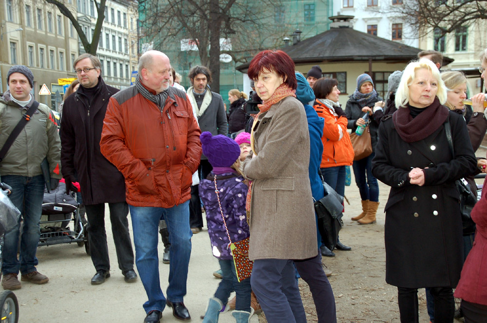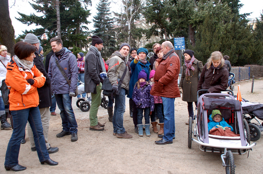 Auf dem Weg über die Berliner Straße, den Wilhelmsplatz bis hin zur Frauenkirche diskutierten die zahlreichen Teilnehmer gemeinsam mit Oberbügermeister Siegfried Deinege und Bürgermeister Dr. Michael Wieler über verkehrs- und sicherheitstechnische Aspekte, die für das Leben der Familien im Zentrum der Stadt von Bedeutung sind. Auch die Gestaltung des künftigen „Kirchplatzes“ wurde vorgestellt. Dabei wurden auch Anregungen für künftige familienfreundliche Lösungen aufgenommen.