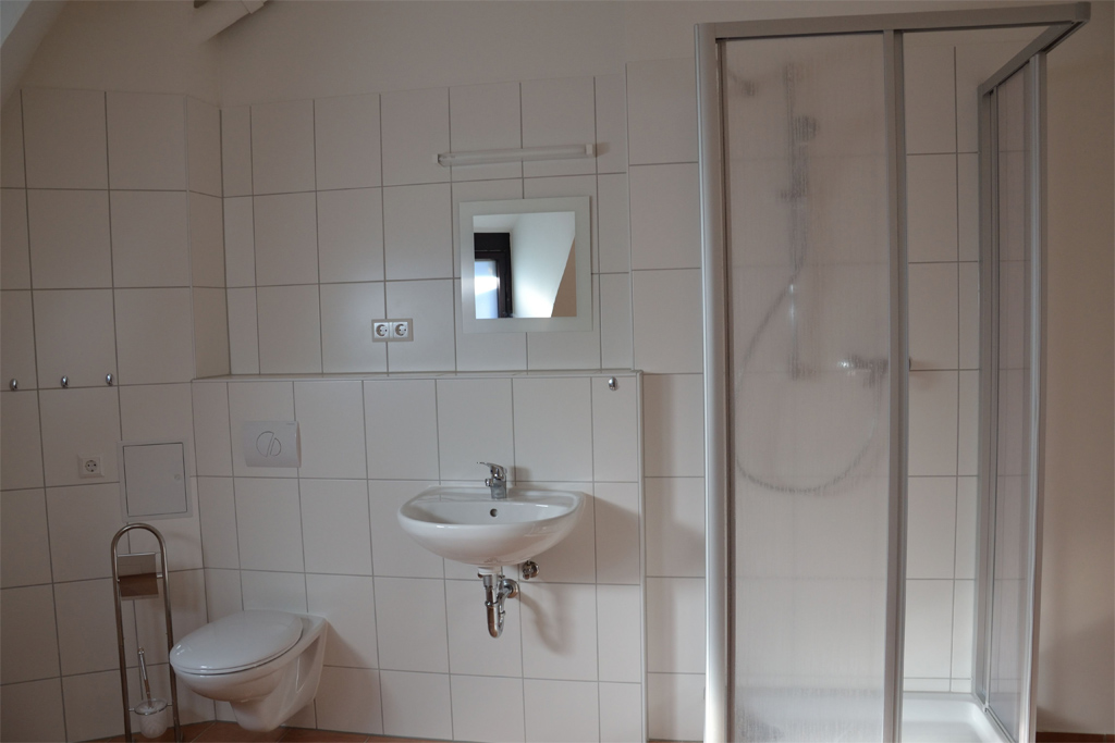 Alternativ steht eine WG im Handwerk 11 zur Verfügung. Der Rahmen ist der gleiche: fünf Minuten mit dem Fahrrad zur Hochschule (15 Minuten zu Fuß), Dreiraumwohnung, drei einzelne Zimmer zur Vermietung, gemeinsame Küche, gemeinsames Bad. Die Wohnung an sich ist aber deutlich größer.