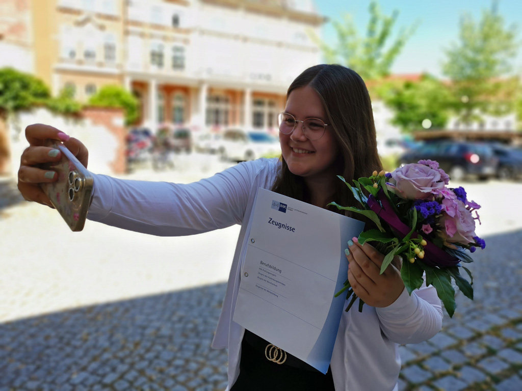 Ein strahlender Blick ins Handy fürs Selfie, vielleicht fürs neue Profilbild: Vanessa Kubelka hat’s geschafft. Heute hat sie ihre letzte Prüfung bestanden und damit die Ausbildung zur Immobilienkauffrau erfolgreich beendet. Ab morgen unterstützt sie unsere Wohnungswirtschaft.