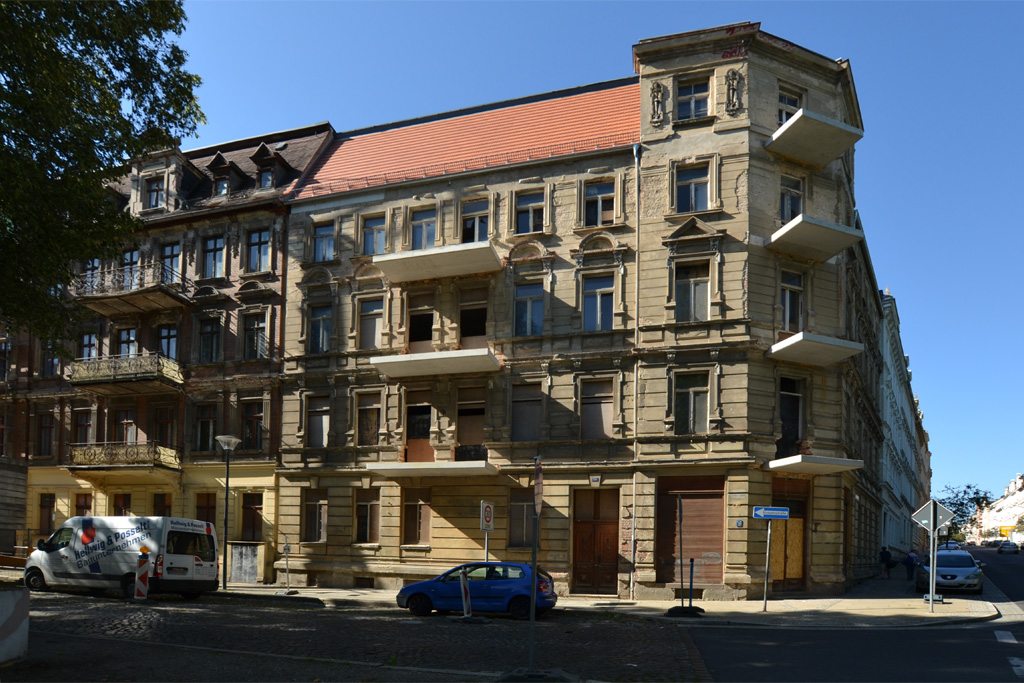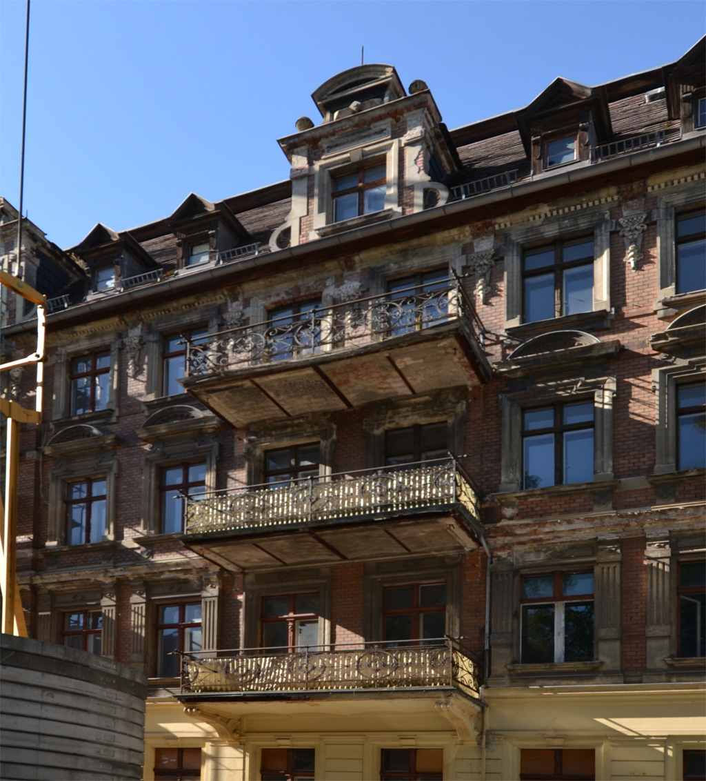 Das Ergebnis lässt sich später mit dem von der Brautwiesenstraße 17/18 vergleichen. Auch am Leipziger Platz werden historische Geländer die neuen Balkone zieren. An Hausnummer 20 sind die alten Balkone im Moment noch dran. Auch sie werden nach historischem Vorbild erneuert. Schließlich stehen die Häuser unter Denkmalschutz.