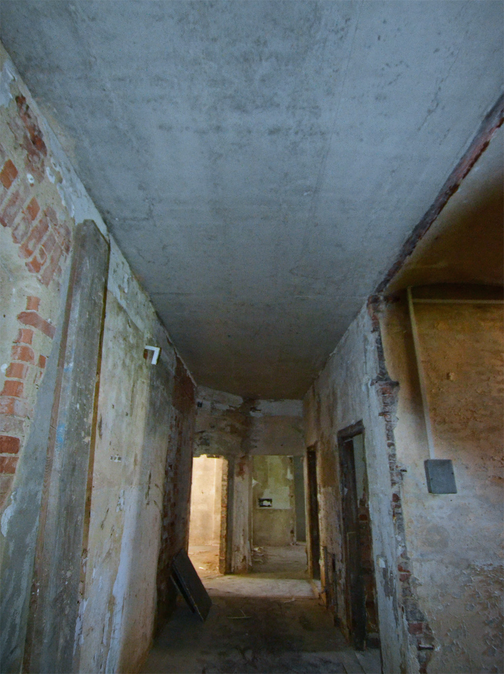 Die Stahlbetondecken sind übrigens bis nach draußen zu sehen. An ihnen „hängen“ nämlich die Bodenplatten für die künftigen Balkone. So kann man schon jetzt sehen, dass das Eckhaus seine historisch belegten Balkone zurückbekommt.