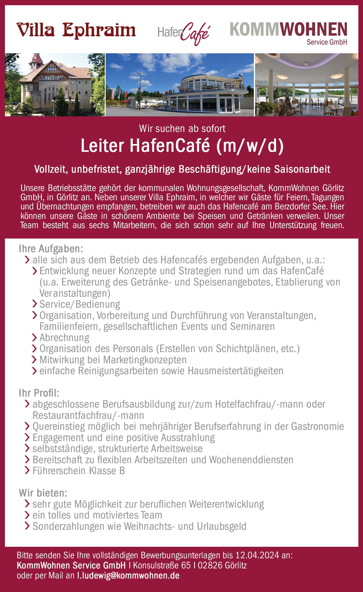 Am schönen Berzdorfer See ist eine interessante Leitungsposition frei. Für unser Hafencafé im Hafen Görlitz suchen wir einen Chef. Es handelt sich um eine abwechslungsreiche Position, an der man viel bewegen kann. Alle Details zu dem angebotenen Job stehen in der Stellenausschreibung: