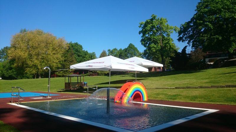 Damit sich junge Familien beim Besuch der im August 2015 neu eröffneten Kindebadelandschaft keinen Sonnenbrand holen, sponsorte die KommWohnen außerdem zwei XXL-Schirme, welche nun seit Mai 2017 Schatten spenden. Wir wünschen dem Verein weiterhin gutes Gelingen bei der Erweiterung des Geländes und allen Besuchern des Helenenbades sonnige Stunden.