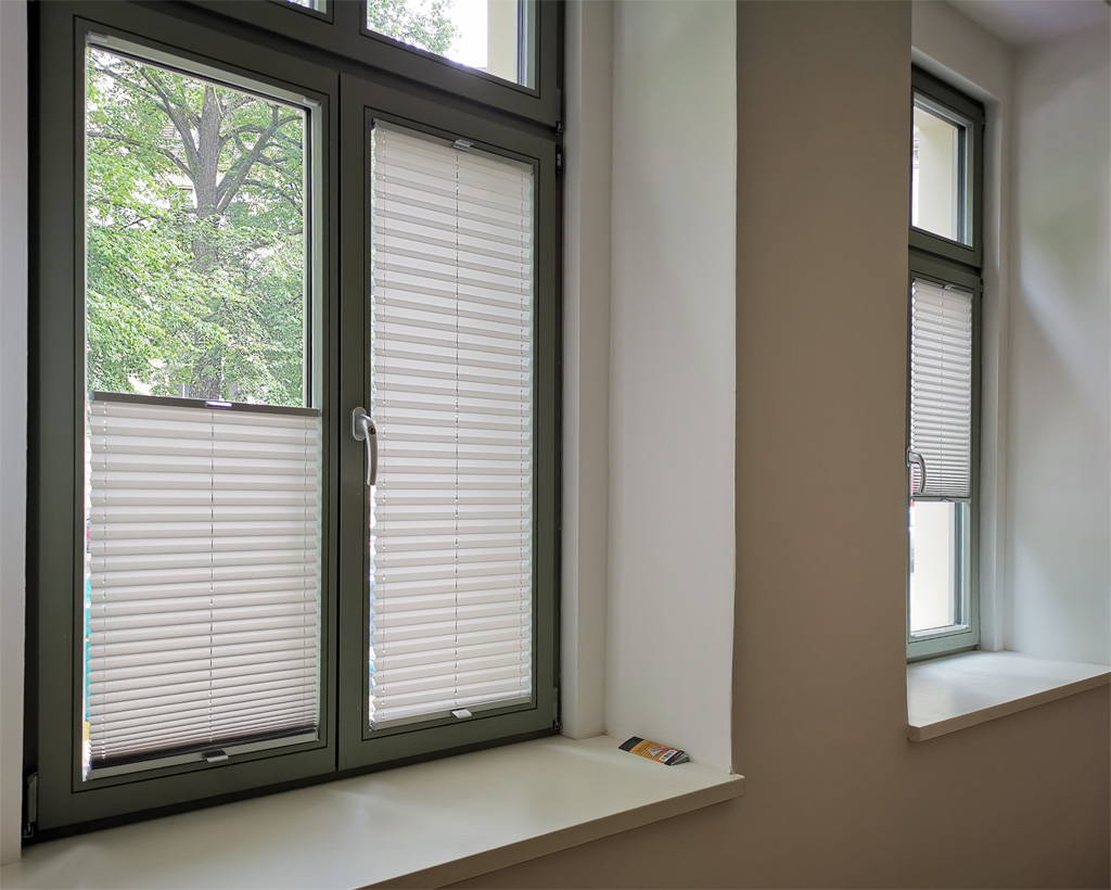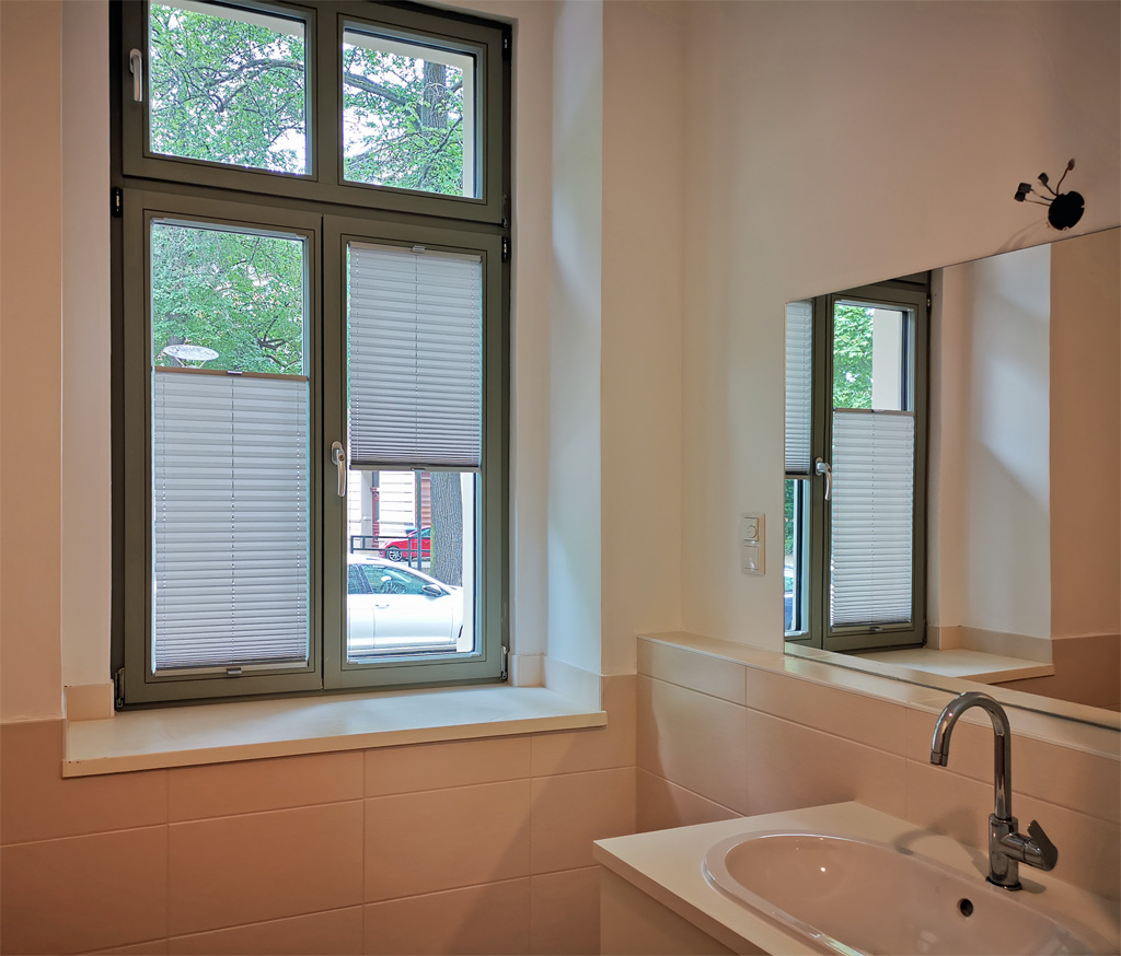 Vielleicht wollen bald alle im Erdgeschoss wohnen. In unseren frisch sanierten Häusern Leipziger Straße 19/20/20a erweitern wir den Wohnkomfort. Alle Wohnungen im Erdgeschoss bekommen Plissees an den Fenstern, die zur Straßenseite hinaus zeigen. So erhalten die Mieter mehr Privatsphäre, weil ungewollte Blicke von Passanten passé sind.