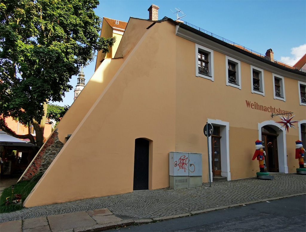 Der Anbau an der Fleischerstraße 19 (das Haus mit dem Eingang zum Weihnachtshaus) ist wieder schick. Der Zahn der Zeit hatte an der Fassade genagt und den Putz bröckeln lassen. Auch die Gestaltung der Tür war nicht mehr ideal. Da sich auf der Wiese hinter dem Anbau mittlerweile der Biergarten des gegenüberliegenden Hotels „Zum Klötzelmönch“ etabliert hat, sollte eine Lösung her. Also bekam der Anbau eine Frischekur und eine neue schmiedeeiserne Tür. Jetzt sieht alles wieder schick aus.
