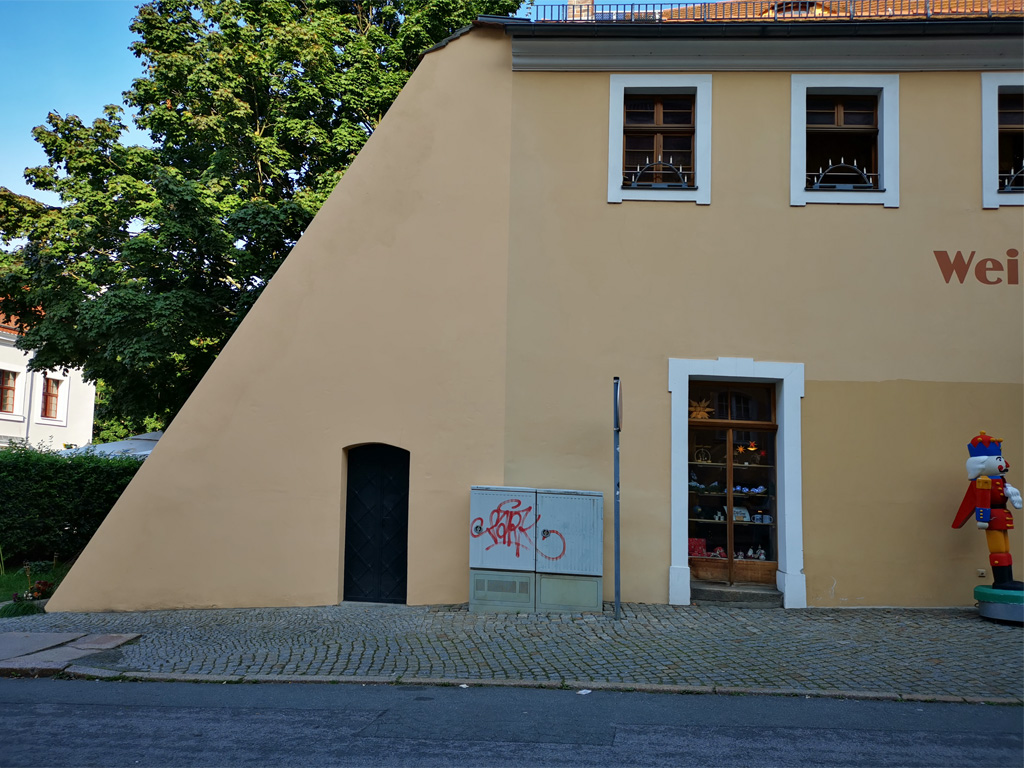 Der Anbau an der Fleischerstraße 19 (das Haus mit dem Eingang zum Weihnachtshaus) ist wieder schick. Der Zahn der Zeit hatte an der Fassade genagt und den Putz bröckeln lassen. Auch die Gestaltung der Tür war nicht mehr ideal. Da sich auf der Wiese hinter dem Anbau mittlerweile der Biergarten des gegenüberliegenden Hotels „Zum Klötzelmönch“ etabliert hat, sollte eine Lösung her. Also bekam der Anbau eine Frischekur und eine neue schmiedeeiserne Tür. Jetzt sieht alles wieder schick aus.