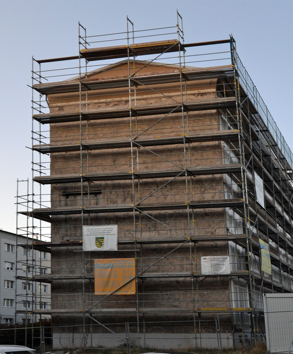Wer alle paar Wochen am Block Arthur-Ullrich-Straße 16 vorbeifährt, kann derzeit jedes Mal eine Veränderung entdecken. An der Straßenseite hat der Rohbau der neuen Fassade mittlerweile die dritte Etage erreicht.