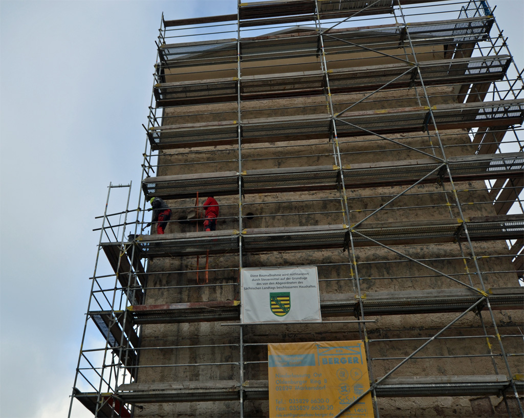 Parallel haben die Bauarbeiter damit begonnen, am Giebel die Stürze für die künftigen Fenster einzubauen. Dazu wird zuerst ein Stück aus dem Giebel geschnitten, in dessen Loch dann der Sturz kommt. Keine einfache Aufgabe ohne Kran, der wegen des Baugerüsts nicht verwendet werden kann.
