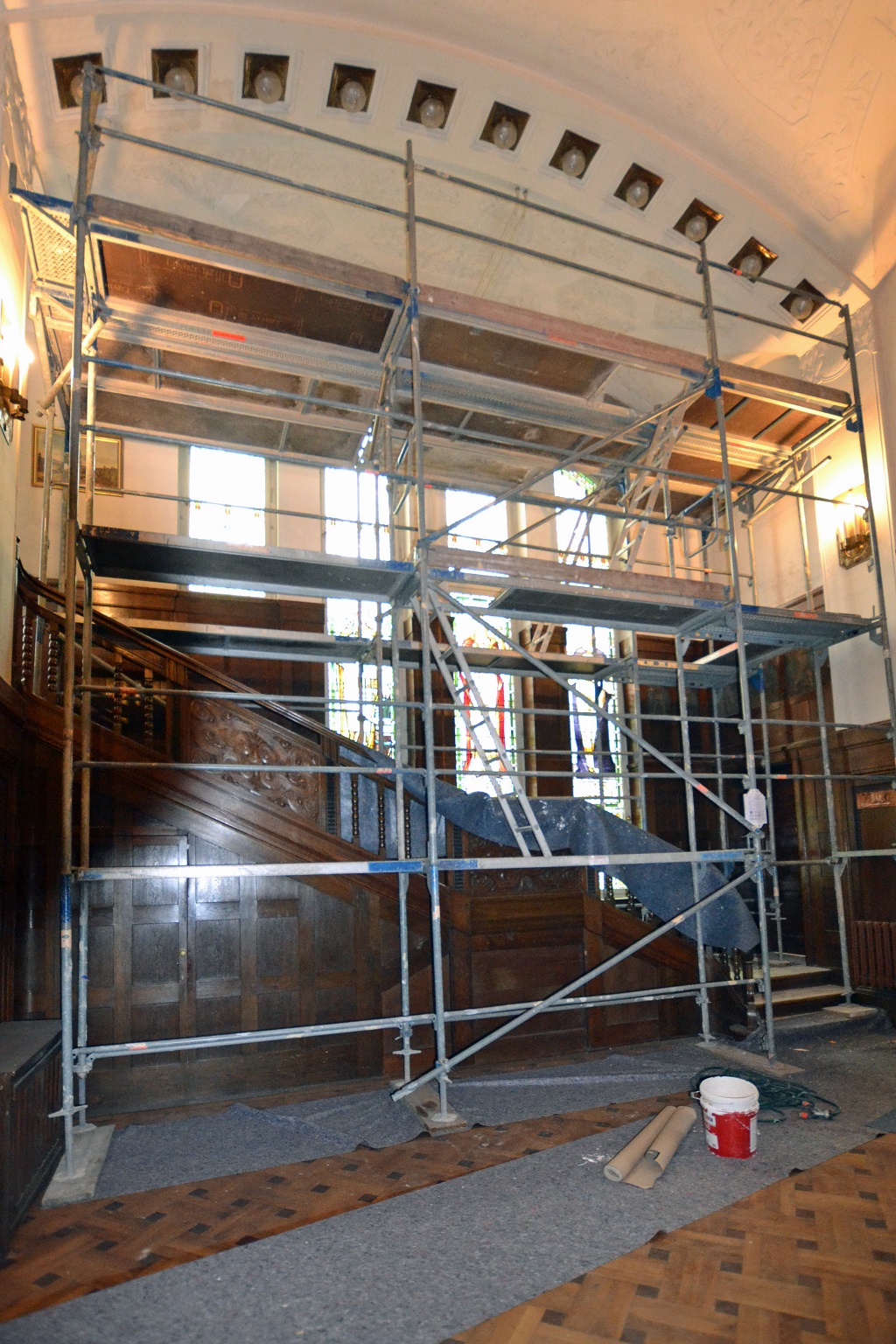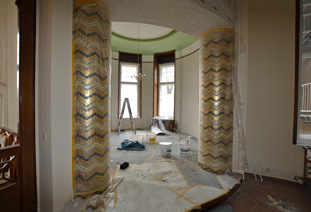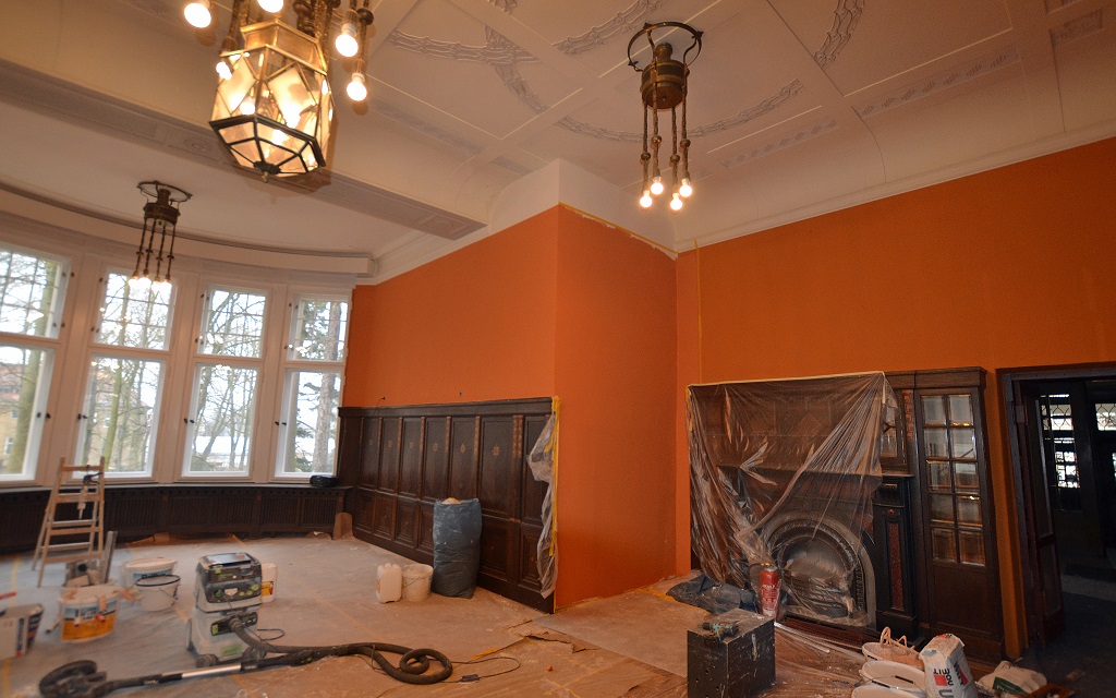 Neuer Glanz für die „Villa Ephraim“ an der Goethestraße! Mitarbeiter unseres Unternehmens sind gerade dort, um kleine Wasser- und Putzschäden in einzelnen Räumen auszubessern. Um den Rest der Ausstattung in der altehrwürdigen Jugendstilvilla zu schützen, mussten vorher einige Planen gespannt werden. Das gibt der Aktion die Anmutung einer großen Baustelle – wie auf den Fotos zu sehen ist. Das über zehn Meter hohe Gerüst in der Eingangshalle zieht später übrigens um ins hintere Treppenhaus. Dort werdeb auch ein paar Ausbesserungsarbeiten erledigt. Dann ist die Villa Ephraim wieder bereit für Feiern aller Art. Die nächste Familienfeier steht übrigens schon in der kommenden Woche an.