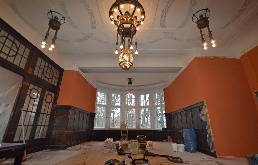 Neuer Glanz für die „Villa Ephraim“ an der Goethestraße! Mitarbeiter unseres Unternehmens sind gerade dort, um kleine Wasser- und Putzschäden in einzelnen Räumen auszubessern. Um den Rest der Ausstattung in der altehrwürdigen Jugendstilvilla zu schützen, mussten vorher einige Planen gespannt werden. Das gibt der Aktion die Anmutung einer großen Baustelle – wie auf den Fotos zu sehen ist. Das über zehn Meter hohe Gerüst in der Eingangshalle zieht später übrigens um ins hintere Treppenhaus. Dort werdeb auch ein paar Ausbesserungsarbeiten erledigt. Dann ist die Villa Ephraim wieder bereit für Feiern aller Art. Die nächste Familienfeier steht übrigens schon in der kommenden Woche an.