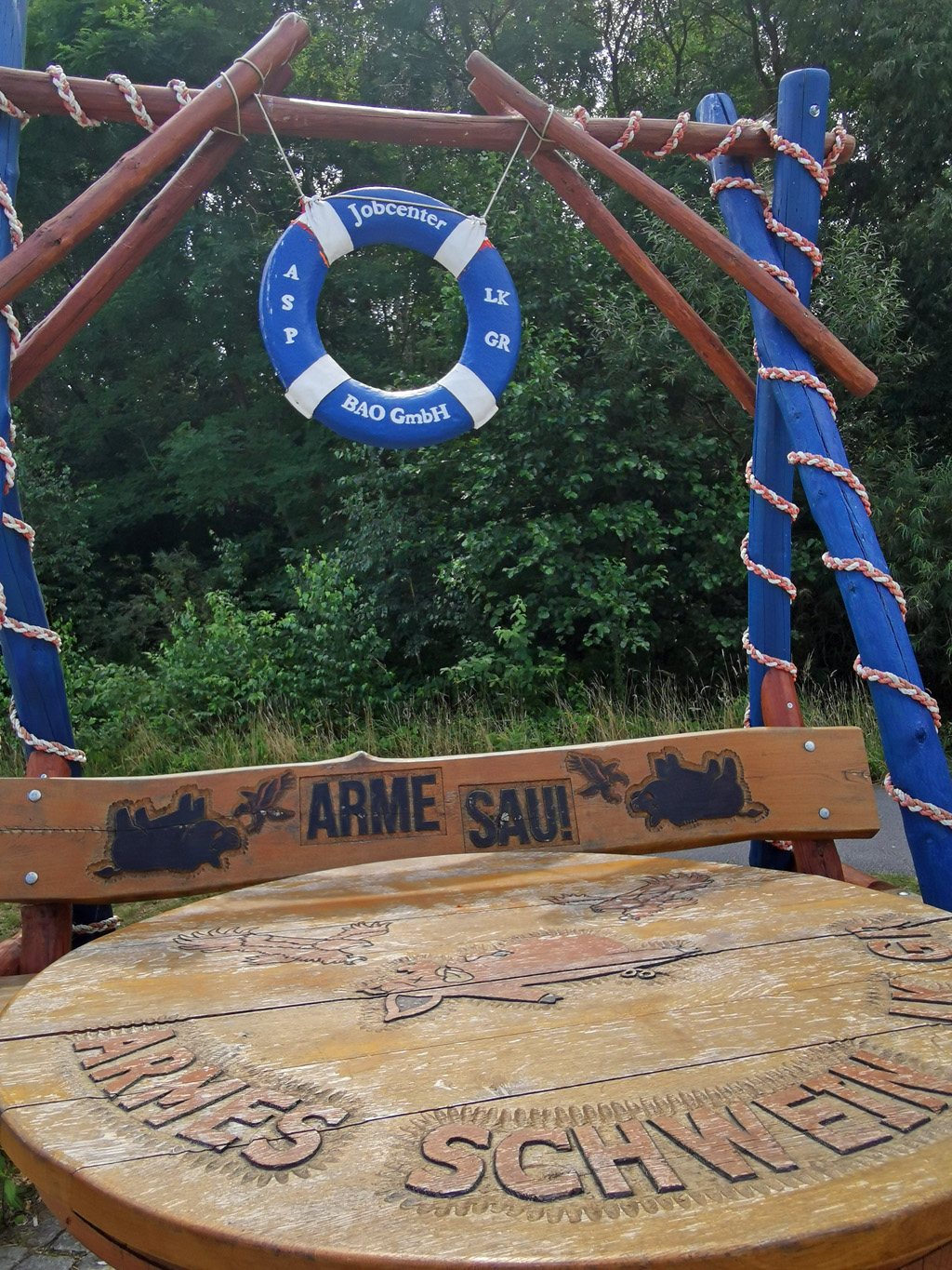 Etwas länger steht schon die sogenannte Schweinebank am Südufer des Hafenbeckens. Die bao-Mitarbeiter haben sie anlässlich der Schweinepest erstellt. „Armes Schwein“ steht auf dem dazugehörigen Tisch, „arme Sau“ an der Lehne der Bank.