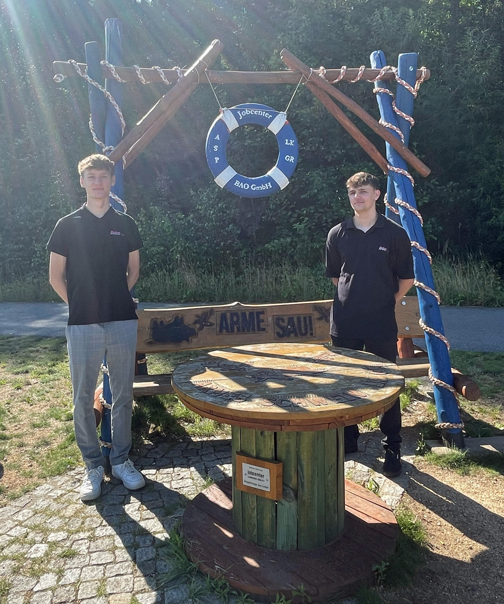 Getischlert wurde sie maßgeblich von Filip Dewelk und Sebastian Drescher. Die beiden haben anlässlich der Einweihung des Lounge-Boots jetzt noch einmal an ihrer Bank posiert.