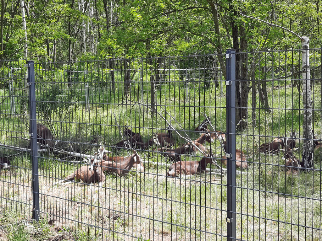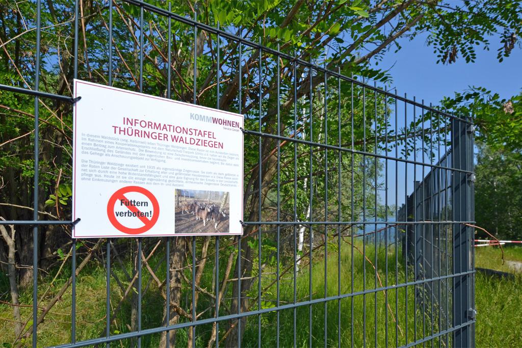 Und das steht auf den Schildern: In diesem Waldstück (sog. Halbinsel) leben Thüringer Waldziegen. Diese Rasse ist vom Aussterben bedroht. Im Rahmen eines Kooperationsprojekts mit dem Naturschutz-Tierpark Görlitz halten wir die Ziegen als einen Beitrag zum Artenschutz. Die Beweidung ist eine Zwischennutzung, bevor die touristische Erschließung des Geländes mit den eigentlichen Bau- und Investitionsvorhaben beginnt. Bis dahin steht das Gehege als Anschauungsobjekt zur Verfügung.