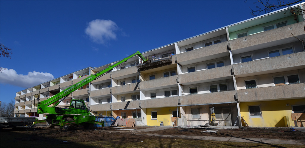 In Königshufen hat mit der Antonstraße 23 bis 29 unsere nächste Baustelle begonnen. Am Freitag wurde das Gerüst gestellt, am Dienstag kommt der Kran. Er wird gebraucht, um die alten Balkons abzubauen und Platz zu machen für neue größere XXL-Balkons. Die für den Abbruch nötigen Löcher sind schon in den alten Balkonbrüstungen zu sehen. Zudem wird das Haus energetisch saniert, also u.a. mit besserer Wärmedämmung versehen. Die Mieter im Erdgeschoss können sich auf Mietergärten freuen, zu denen sie direkt von ihrer Wohnung aus Zugang haben werden. Dieses Konzept erfreut sich bereits u.a. am Nordring großer Beliebtheit.