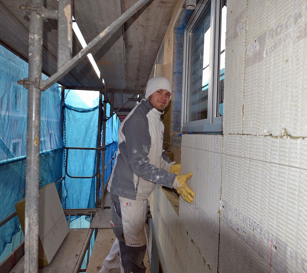 Sie trotzen wacker der Kälte. Mitarbeiter des Baubetriebs Schur aus Kringelsdorf bei Boxberg bringen derzeit die Wärmedämmung am Block Hainwald 3-6 an. Maurer Fritz Brauner (Foto) und sein Kollege haben sich heute nicht bremsen lassen vom kalten Wind und sind wieder ein gutes Stück vorangekommen.